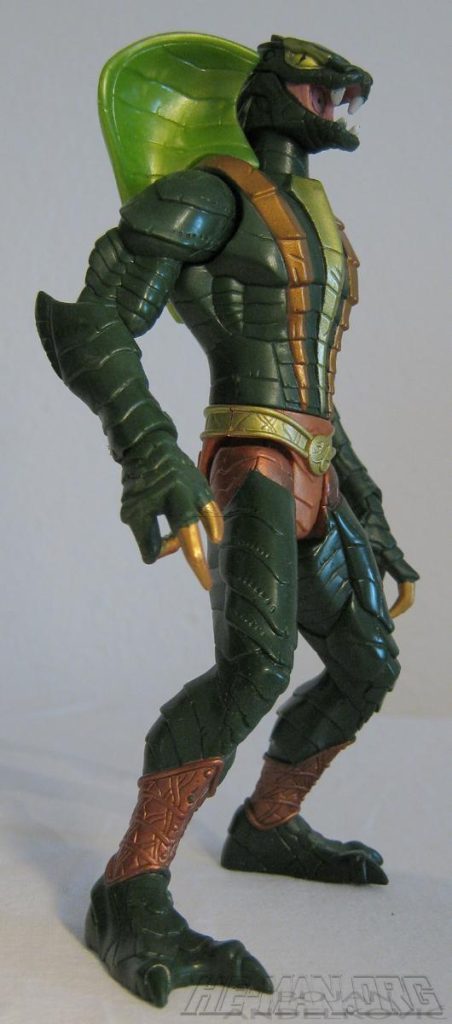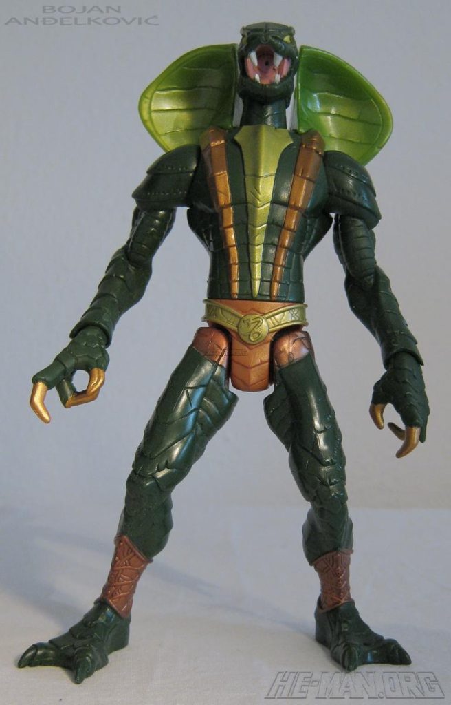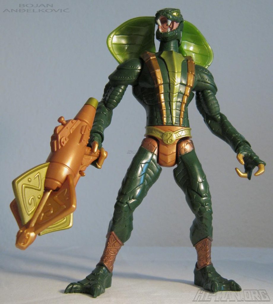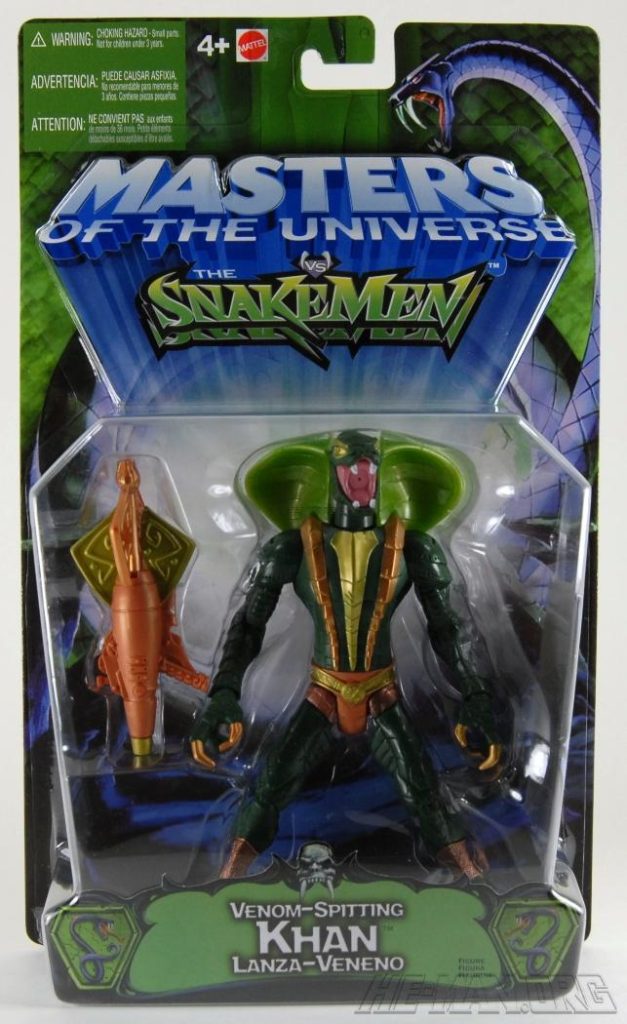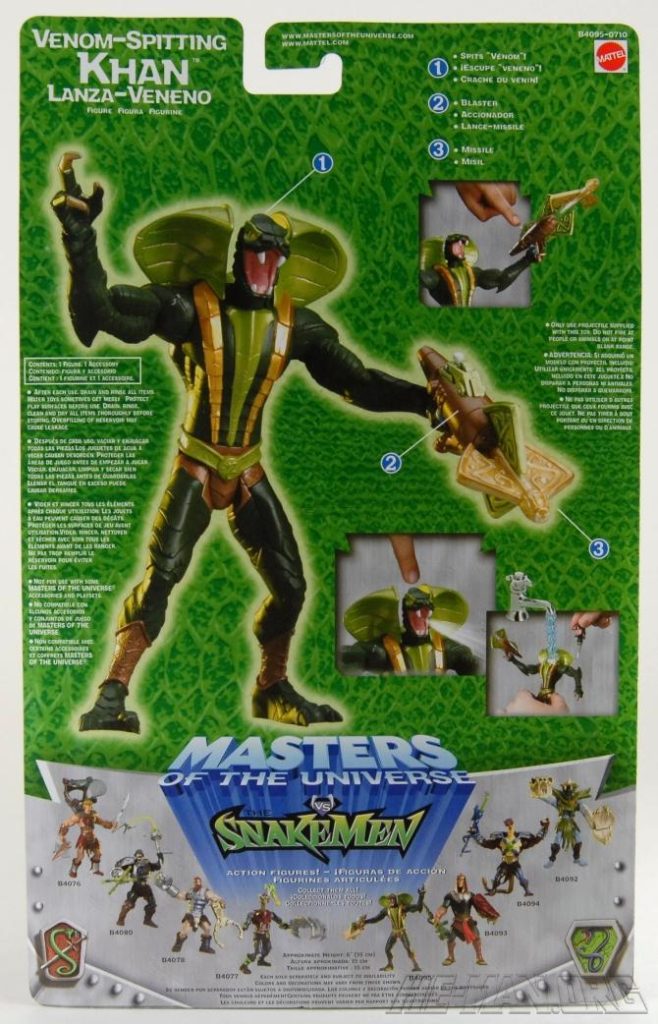 The 200x Kobra Khan figure came with a large blaster. He retained the water-spitting feature of the original 1984 figure, and he came with an oversized gun that could shoot a projectile. He was packaged on the updated green Snake Men card.
