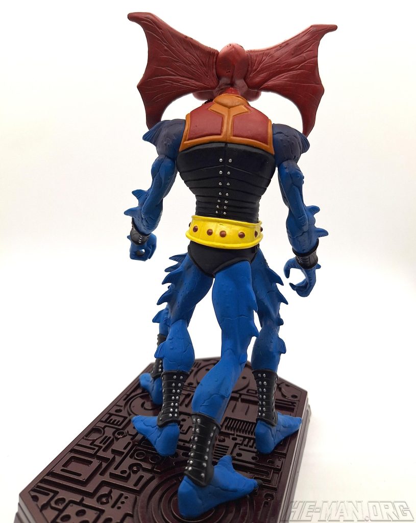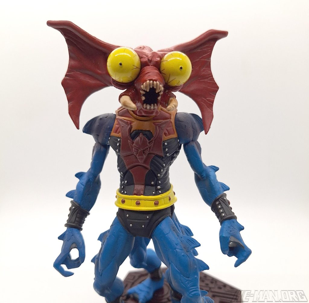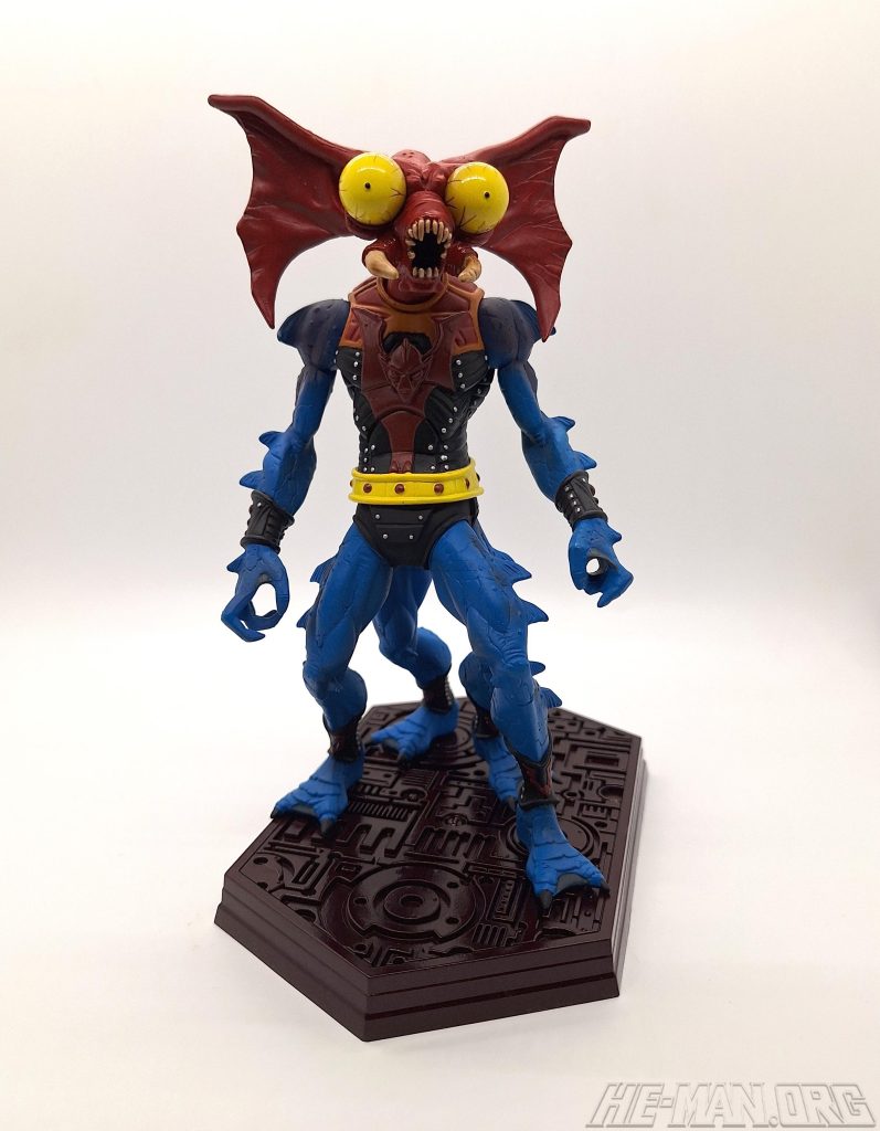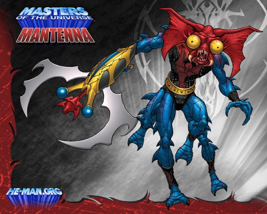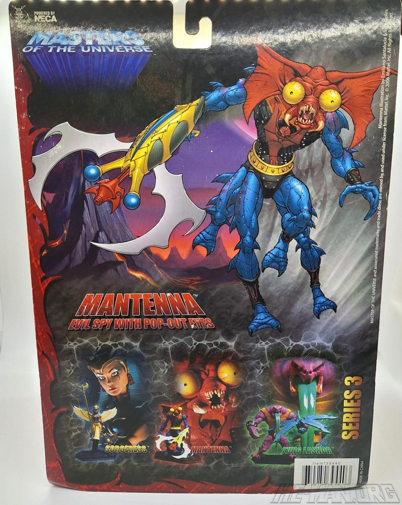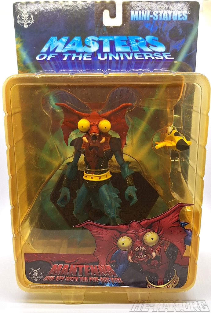 The 200x NECA Mantenna mini statue (“staction”) came with a redesigned Horde crossbow and a stand. Compared to the original 1985 figure he was much thinner and creepier, with a highly detailed sculpt and four separate sculpted legs. The statue was designed by the Four Horsemen, with cardback artwork by Emiliano Santalucia and Val Staples.