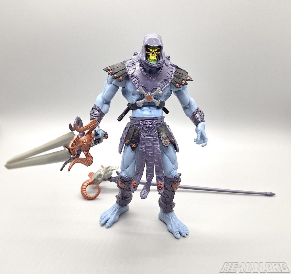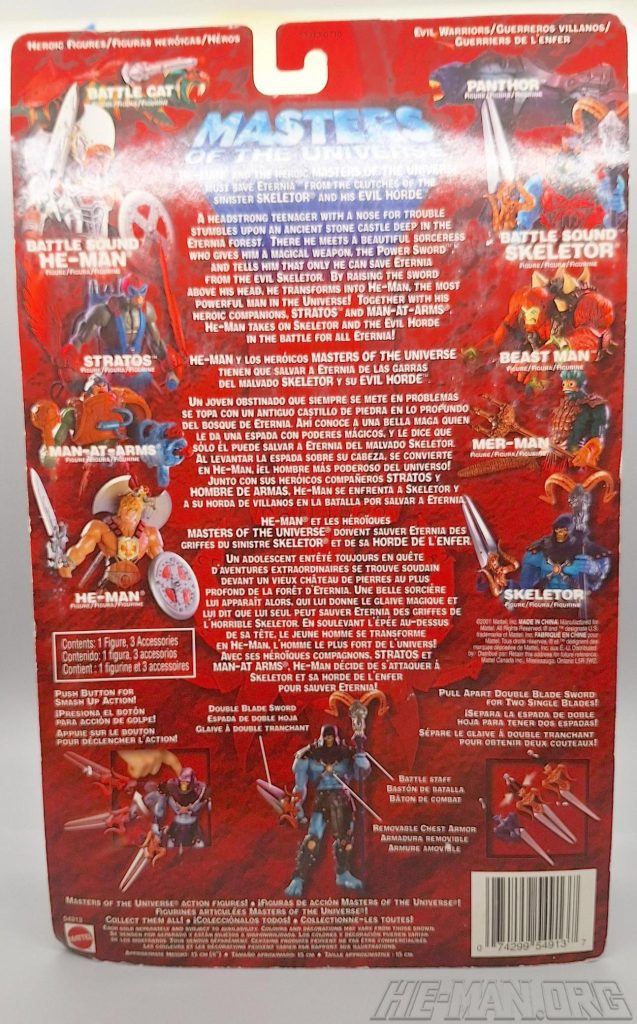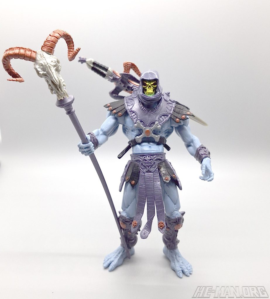 The 200x Skeletor figure came with his Havoc Staff, a split sword, and removable armor. A button on his back, when pressed, would cause his right arm to rotate forward, allowing him to attack his enemies!