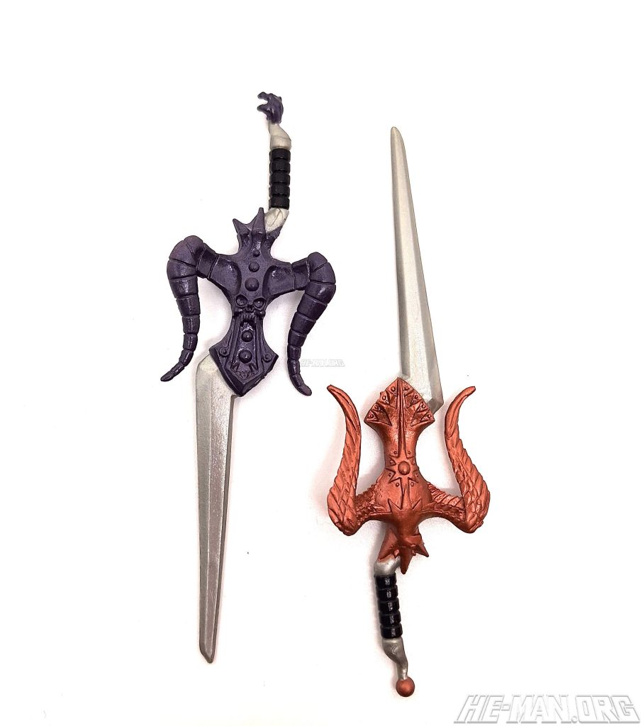 The split sword was originally supposed to be the Power Sword for the line. In the original concept pitched by the Four Horsemen, Skeletor had gotten both halves of the Power Sword and had gained control of Castle Grayskull. Man-At-Arms constructed a new mechanical Power Sword for Prince Adam, and the Sorceress imbued it with the last of her magic to enable Adam to transform into He-Man once more and save Eternia from Skeletor. This idea was not used in the series, but Skeletor retained the split sword anyway, although it was not called the Power Sword.