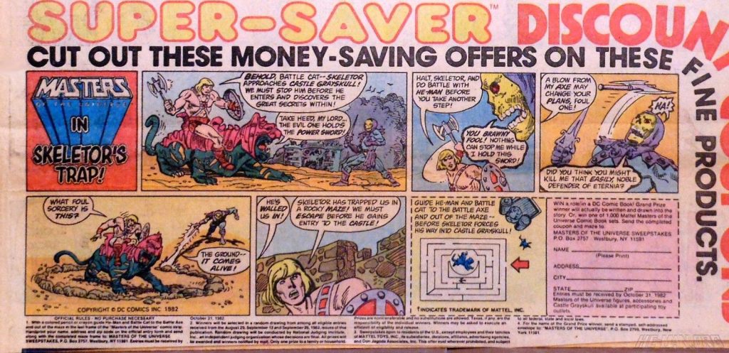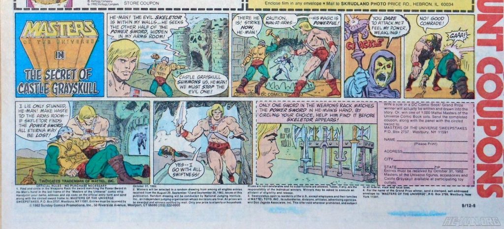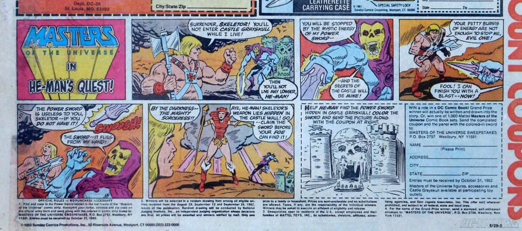 At least three DC comic strips ran in US newspapers in 1982. They were self-contained, simple stories centered around Skeletor’s attempts to gain access to Castle Grayskull. Each of them came with a contest form to either appear in a DC Comics issue as a character, or to win a free set of Masters of the Universe comics.