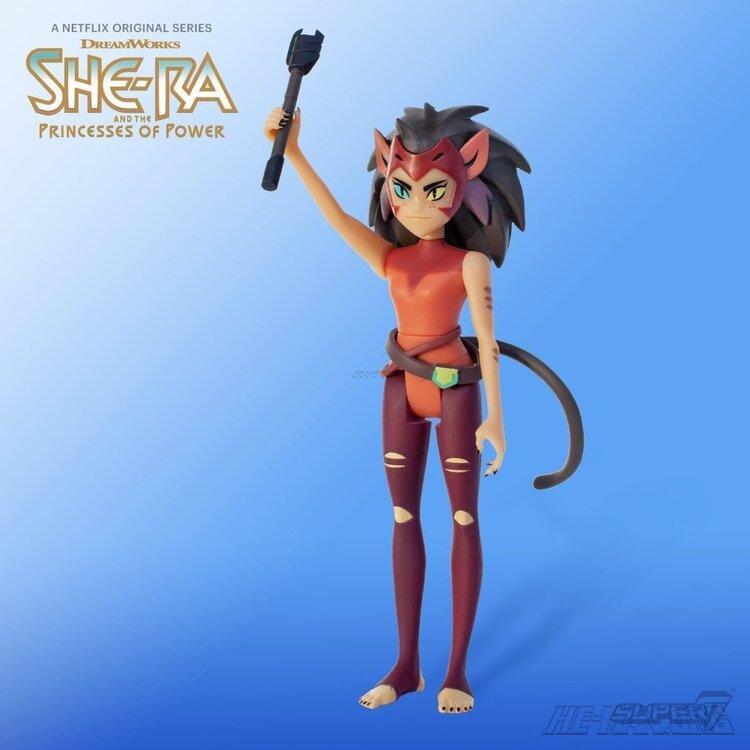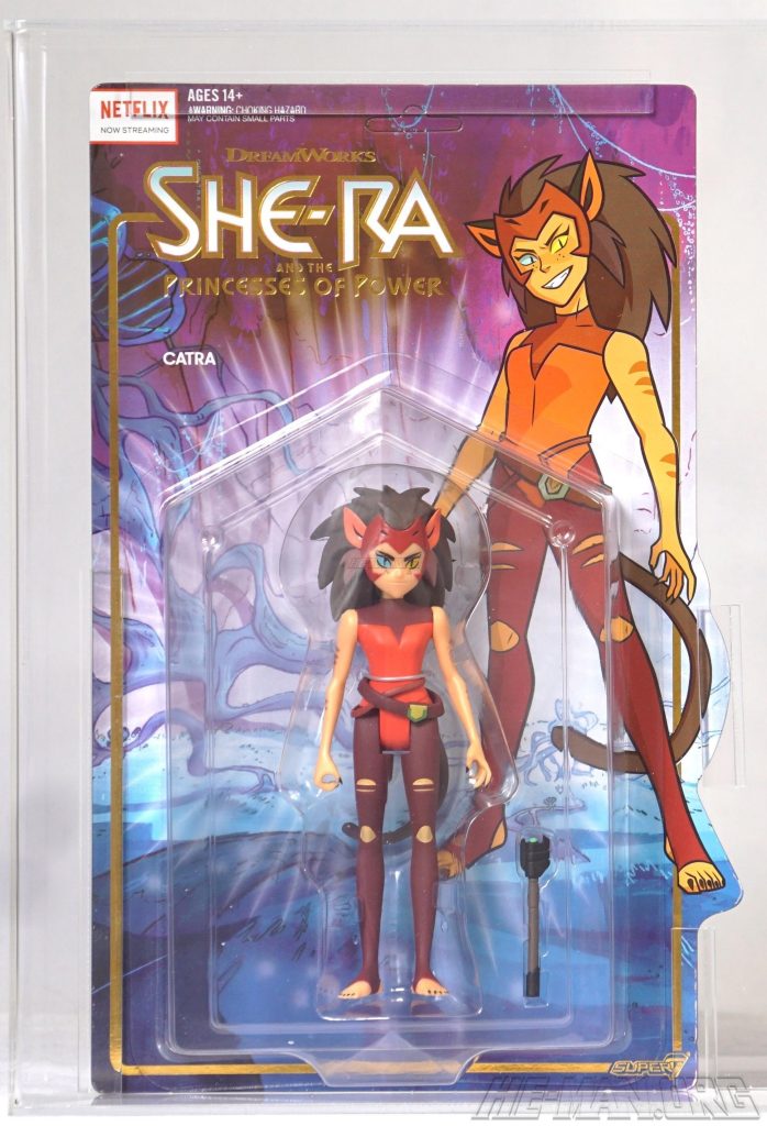 The Super7 version of Catra was minimally articulated, with a fully sculpted and molded hair and belt, and a weapon accessory.