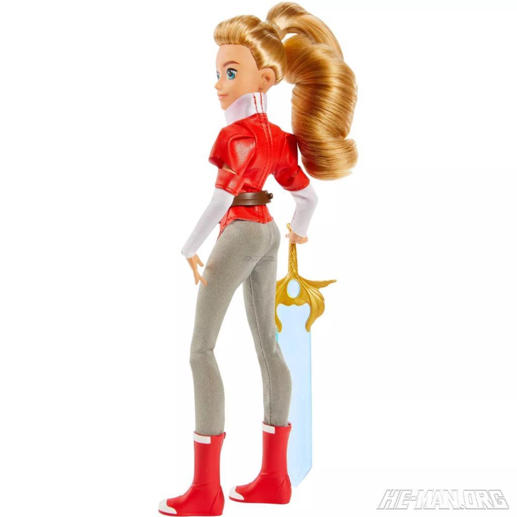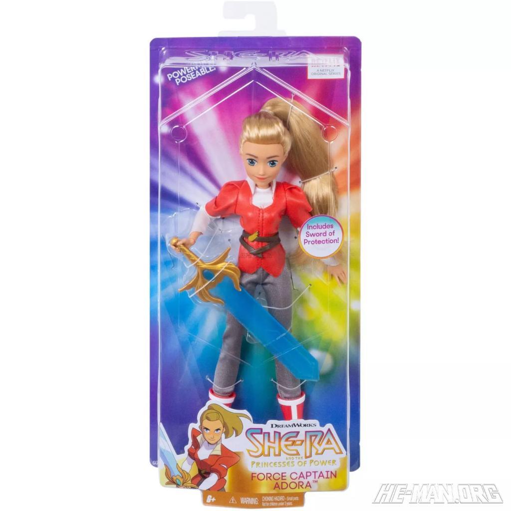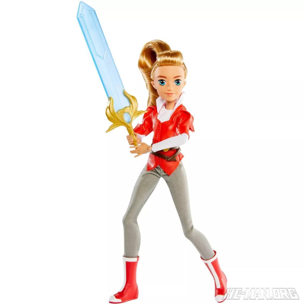 Adora featured a cloth and faux leather outfit, rooted hair, and a translucent blue and metallic gold Power Sword.