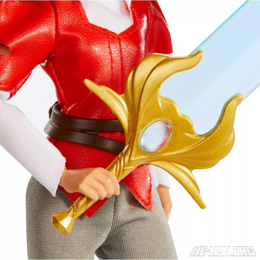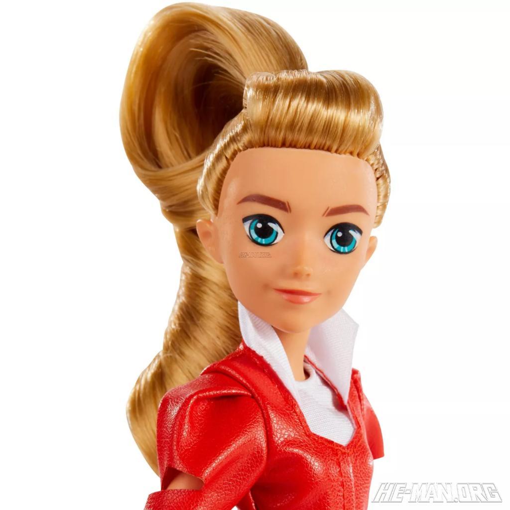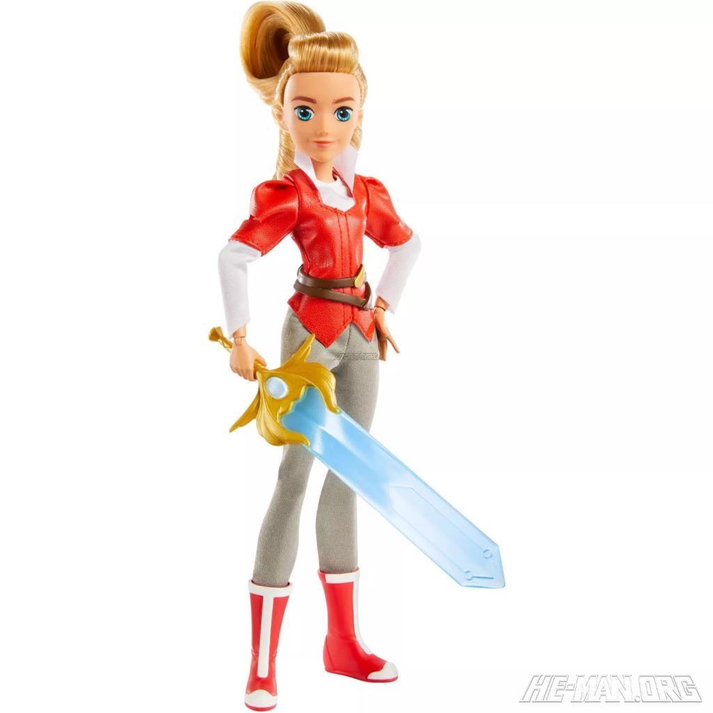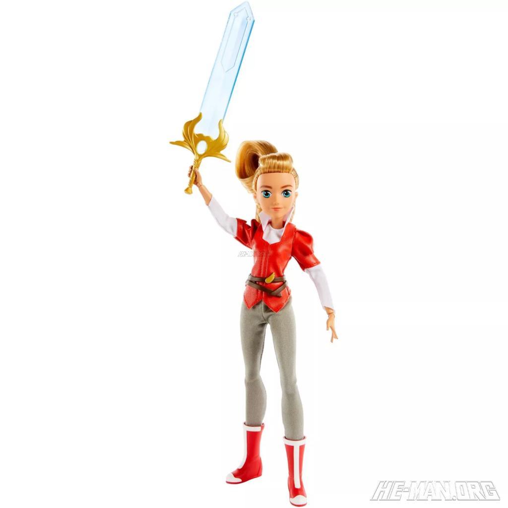 Adora featured a cloth and faux leather outfit, rooted hair, and a translucent blue and metallic gold Power Sword.
