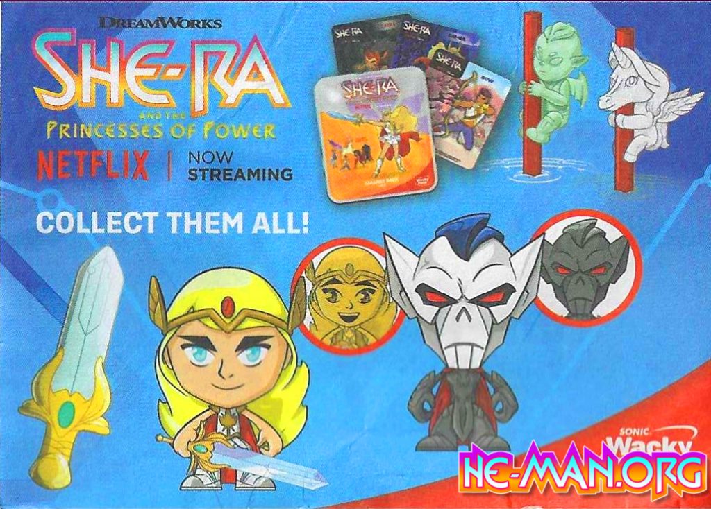 In early 2020, Sonic Drive-In partnered with Mattel and DreamWorks for a She-Ra and the Princesses of Power fast food tie-in promotion. Starting March 2nd, 2020, Sonic offered multiple products from the DreamWorks reboot in their Wacky Pack kids meals. From release date to late March/early April, customers could get a variety of merchandise from action figures to little things to put on straws to magnets.