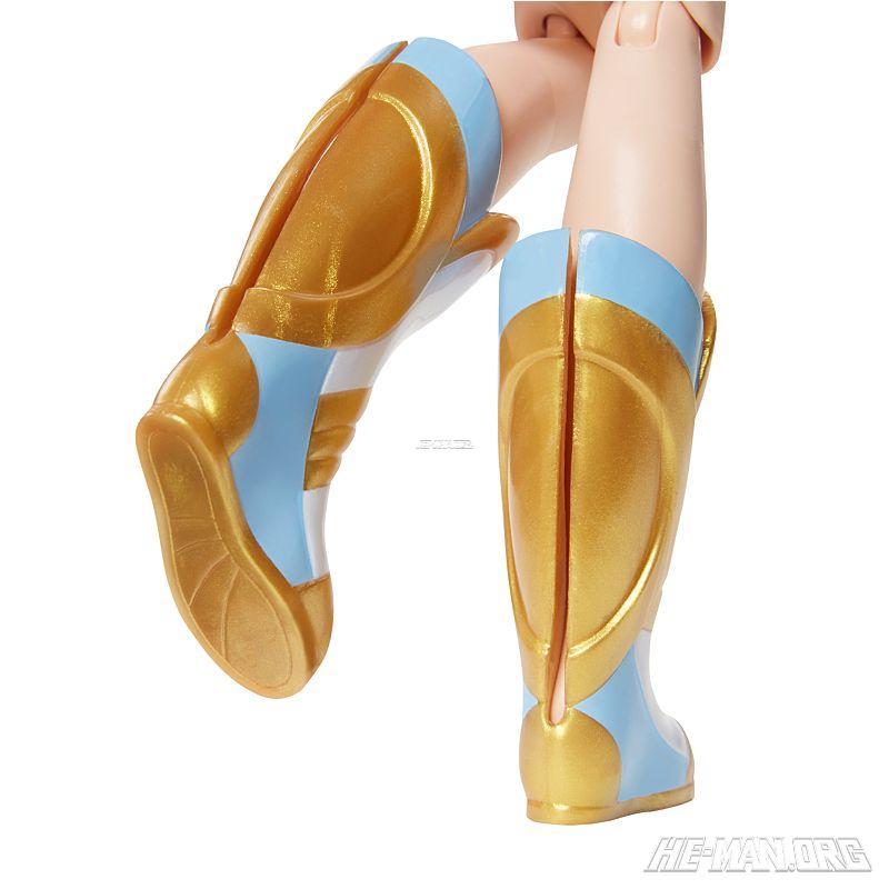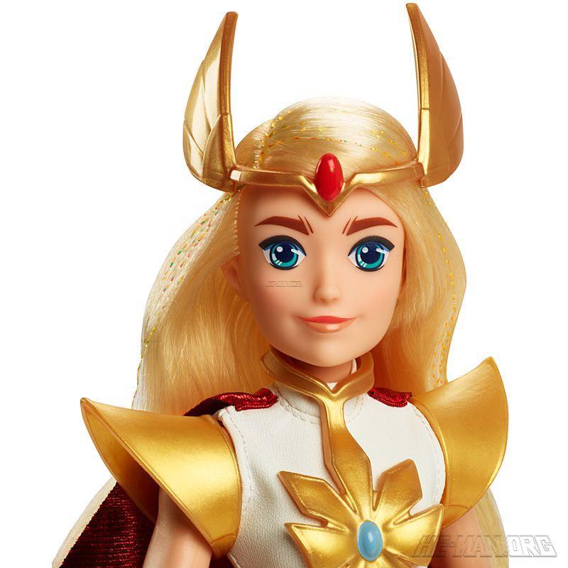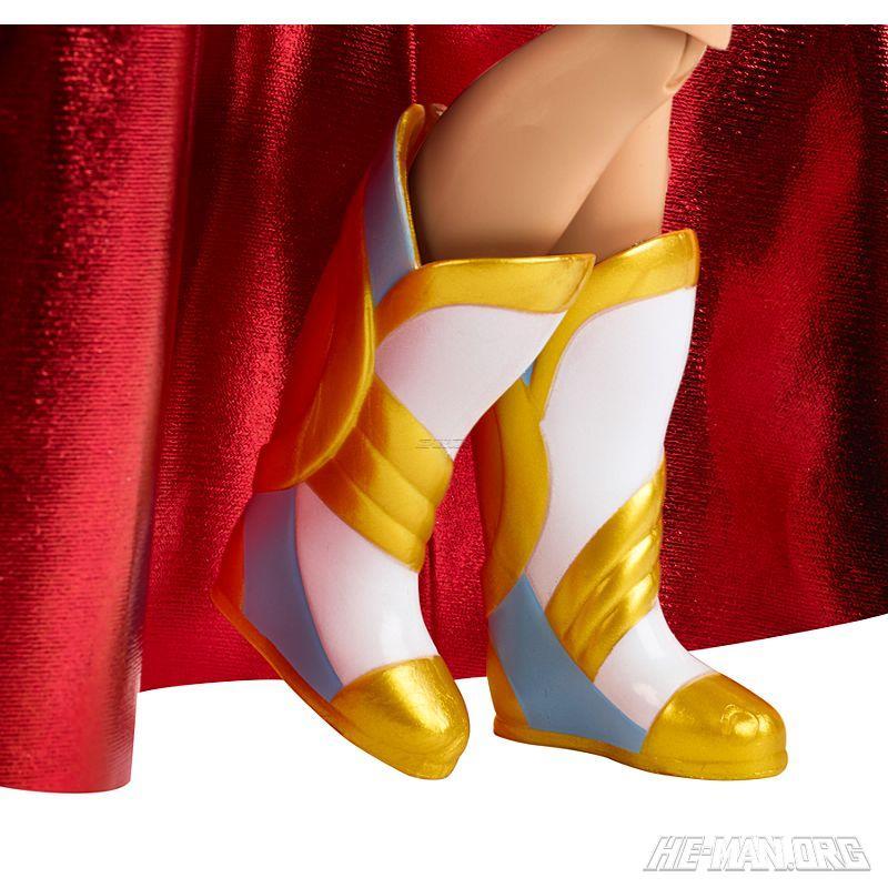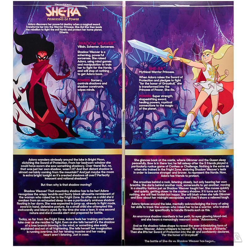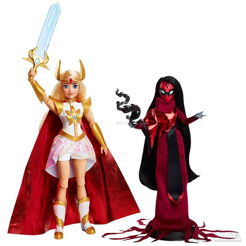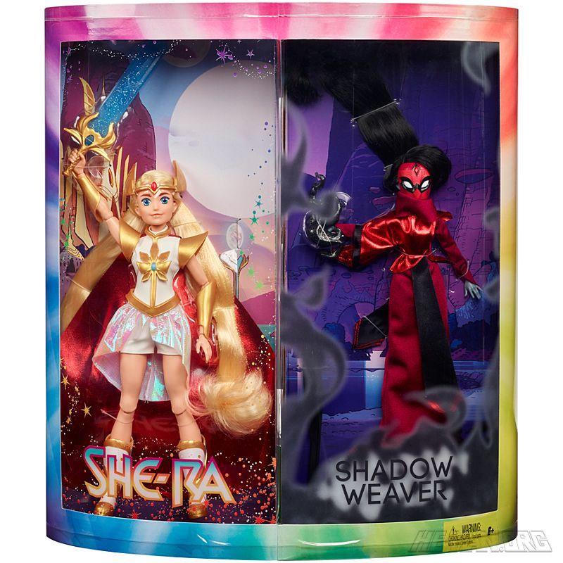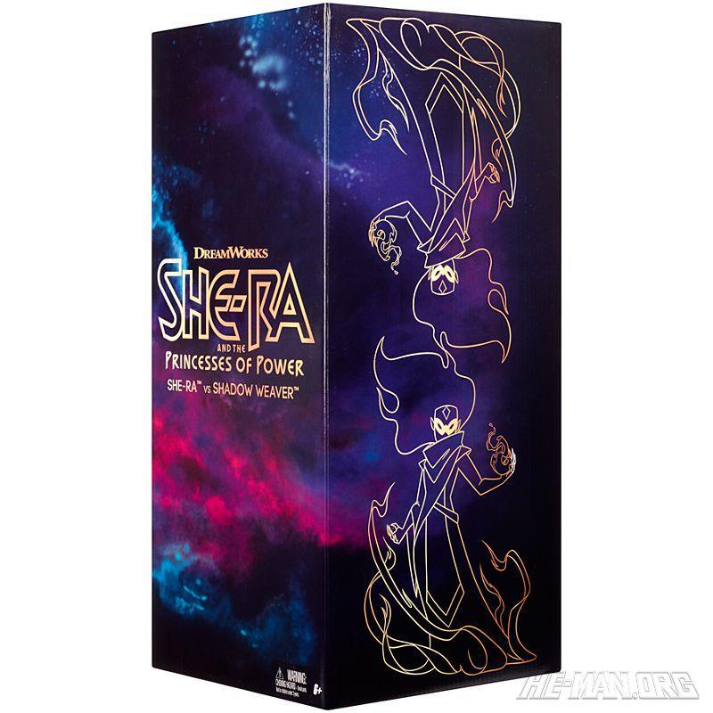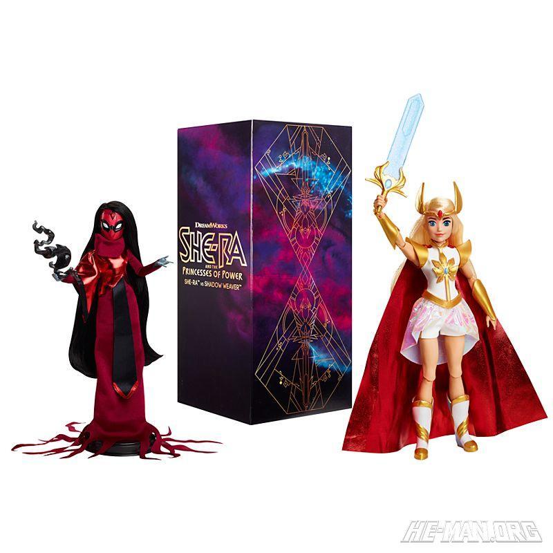 In this deluxe set, She-Ra featured a longer cape and skirt than the single She-Ra release from Mattel. Shadow Weaver featured a cloth outfit, a stand, rooted hair and a dark magic effect.
