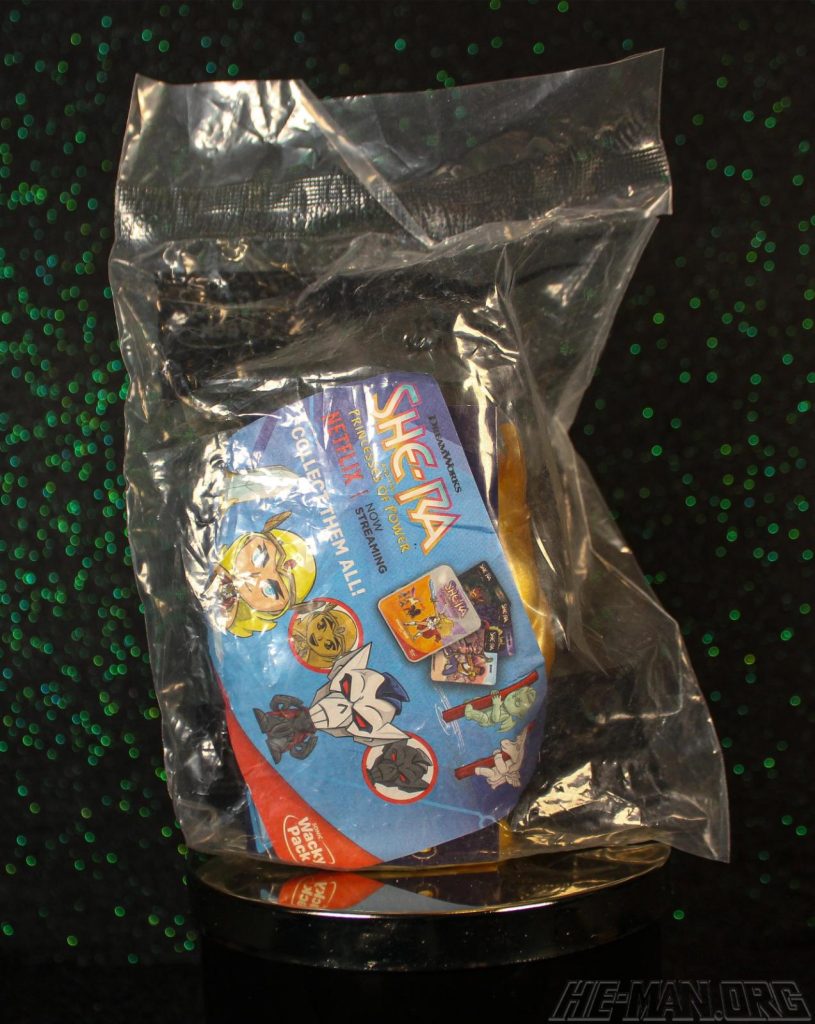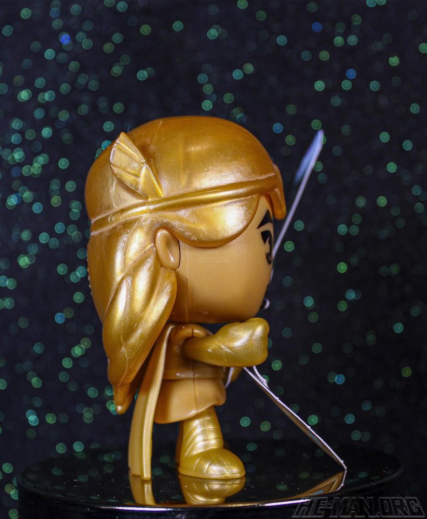 The Gold Edition of the She-Ra action figure depicted the titular heroine in a metallic gold color with a joyous, wide-open smile, and in her warrior outfit seen from seasons one to four of the show, along with a thin card containing her iconic sword and shield. When removed, the sword and shield, could be placed in her hands, with the shield requiring two bends on a handle to get the necessary shape for proper grasping. Poseability was limited to the head and arms. Summary and images courtesy of Robert Labandeira.