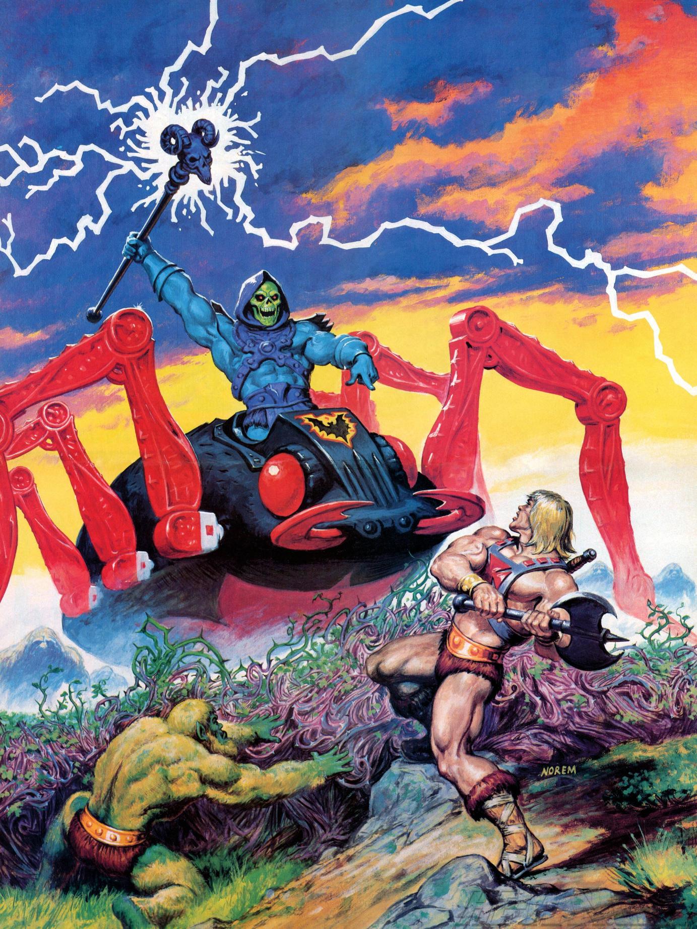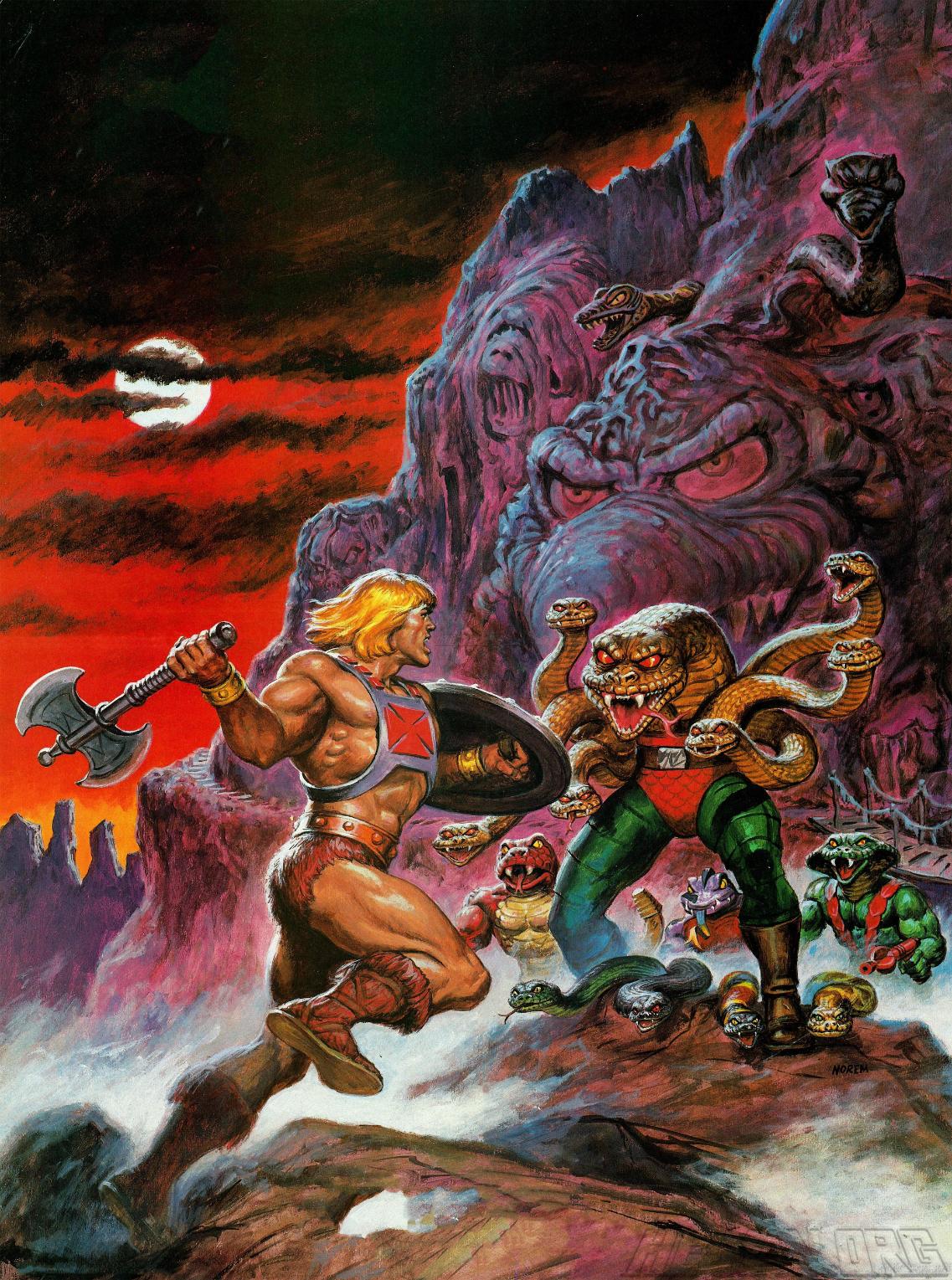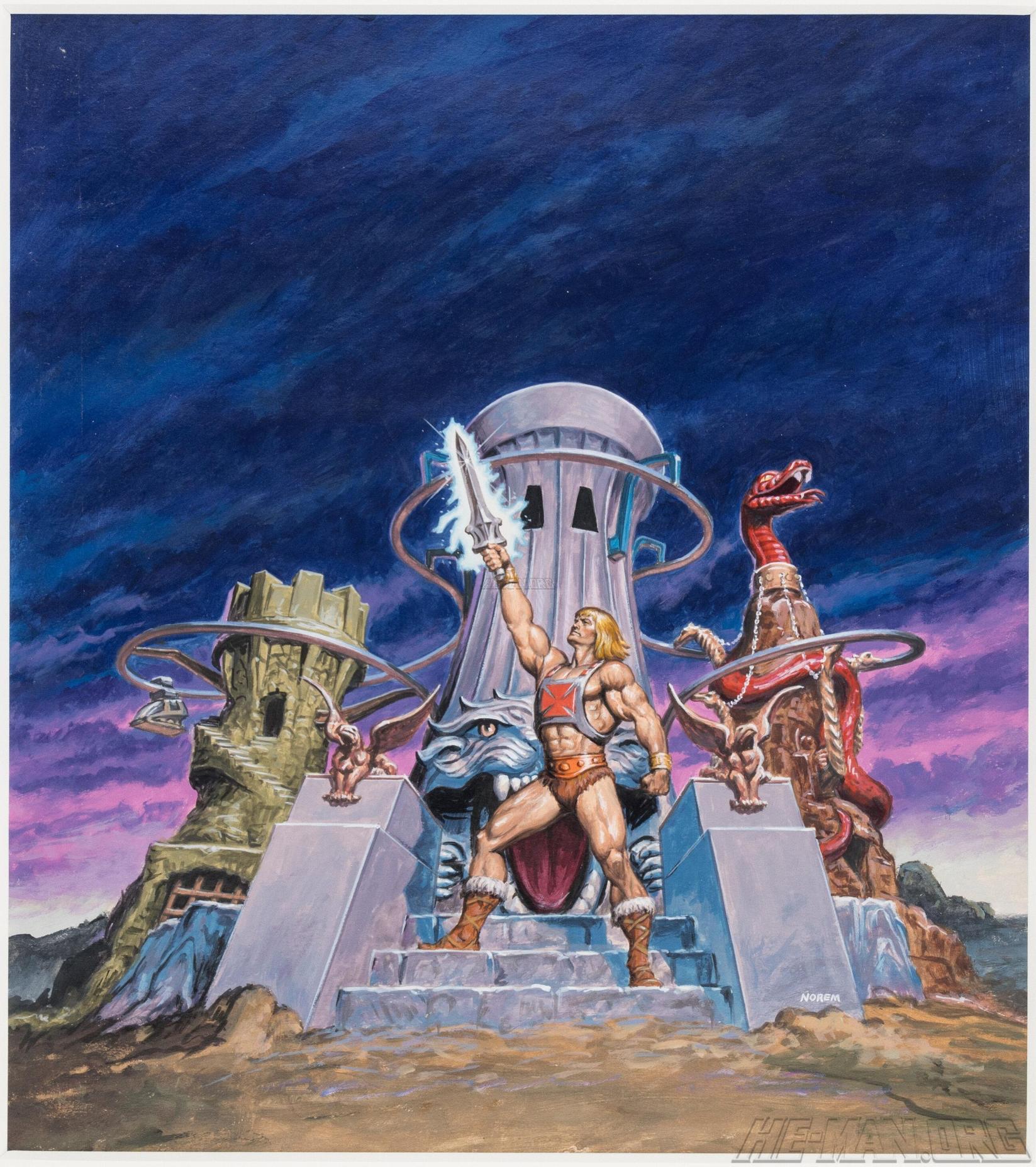 Earl Norem created a number of posters for the Masters of the Universe line, which are collected below. The titles used are descriptive, and don’t represent any official title attached to this artwork.