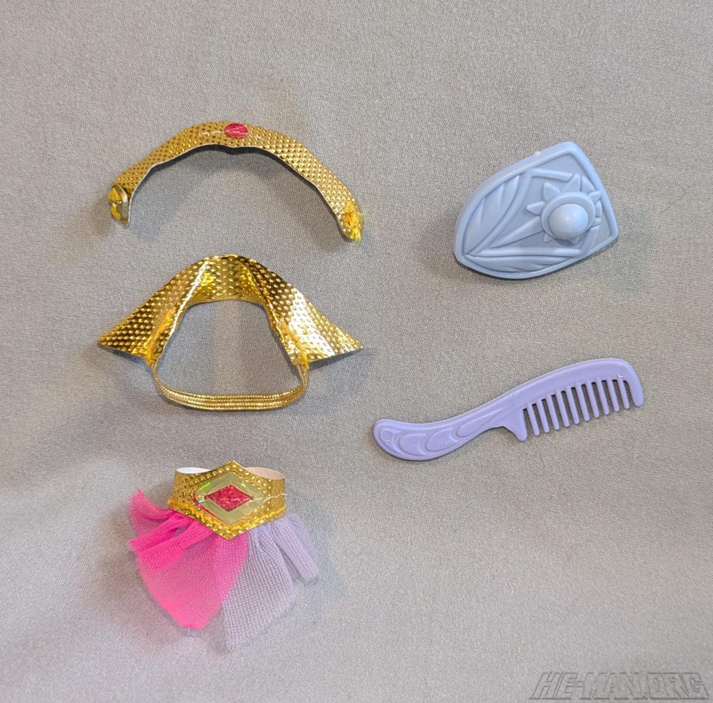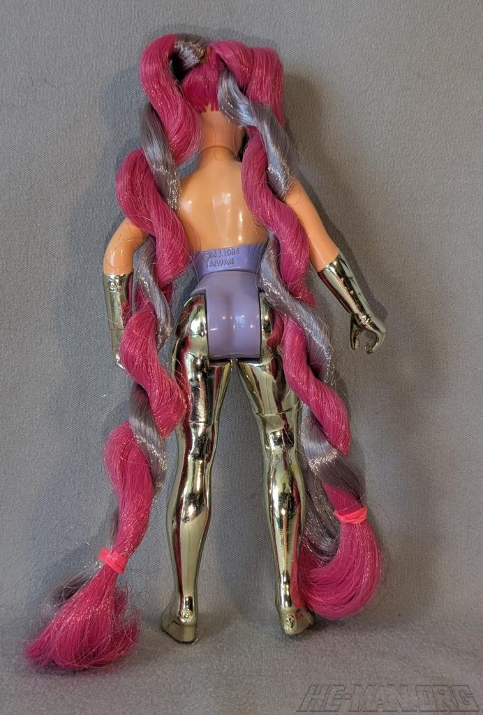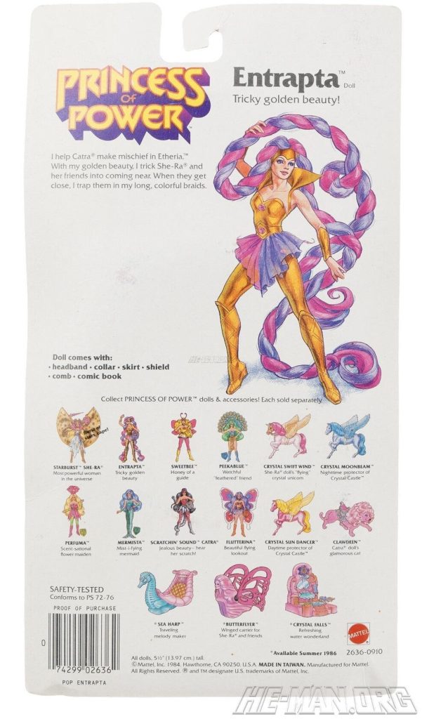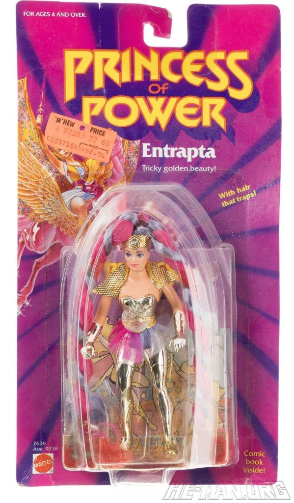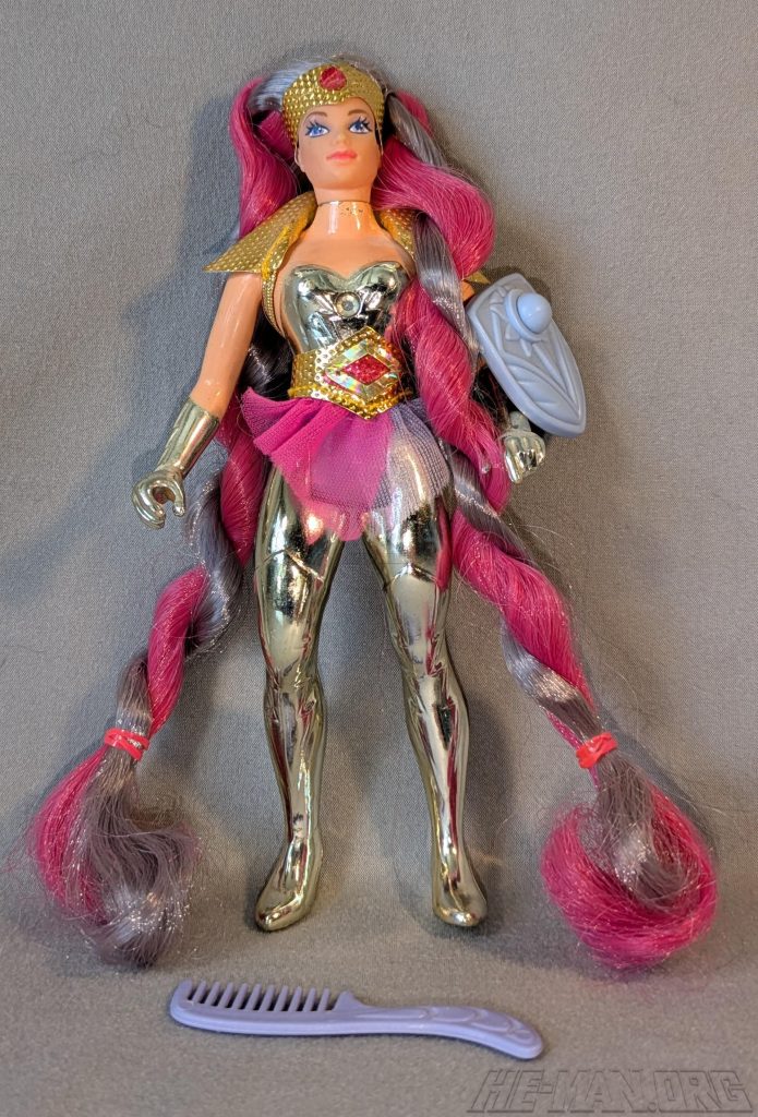 Entrapta was the tricky golden beauty in the Princess of Power line. She featured a cloth goods skirt, collar and head band, as well as a shield and a comb. She had long flowing hair that could be used to “trap” her enemies!