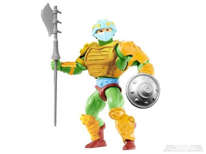 MOTU Origins Eternian Palace Guard was based on the characters that appeared in the 1980s Filmation He-Man and the Masters of the Universe cartoon. He came with two separate heads, a club, a shield, a poleaxe, and removable armor. By swapping the included parts, the character could be transformed into Man-At-Arms, without the mustache.