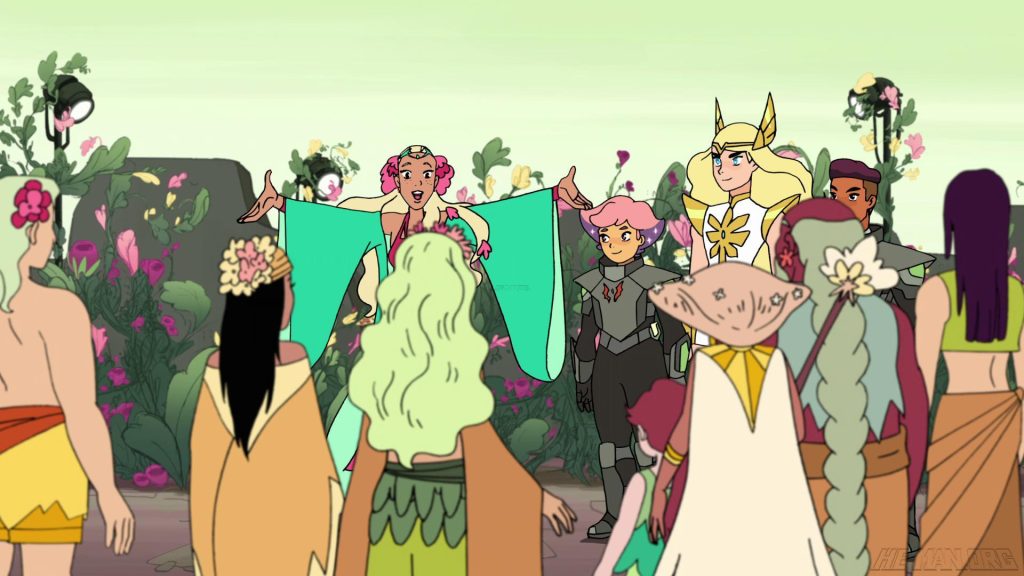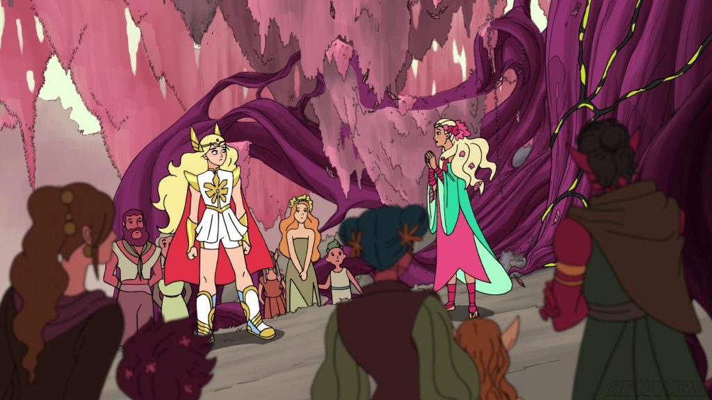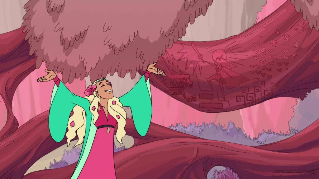 As the Best Friend Squad arrives at Plumeria, Adora begins to struggle with the fear that people only love her for her role as She-Ra, and not who she is at her core. After discovering the plants are dying, The Best Friend Squad is greeted by Perfuma who explains the prophecy of their kingdom states the She-Ra will arrive to solve their problems. After a celebration, and some overly dramatic mythologizing regarding She-Ra’s accomplishments from Bow, it is shown that the Horde has established a facility nearby choking the life out of the Plumerian forest. After trying to single-handedly revive their Heart-Blossom (the main tree of the forest containing Perfuma’s runestone), She-Ra reveals she is simply an ordinary girl at her core. Perfuma and the Plumerians decide to evacuate while the Best Friend Squad decides to infiltrate the facility.