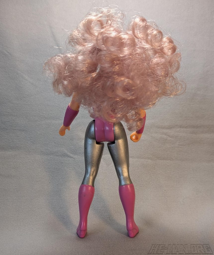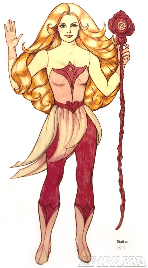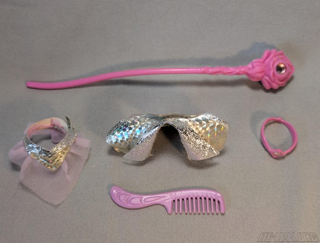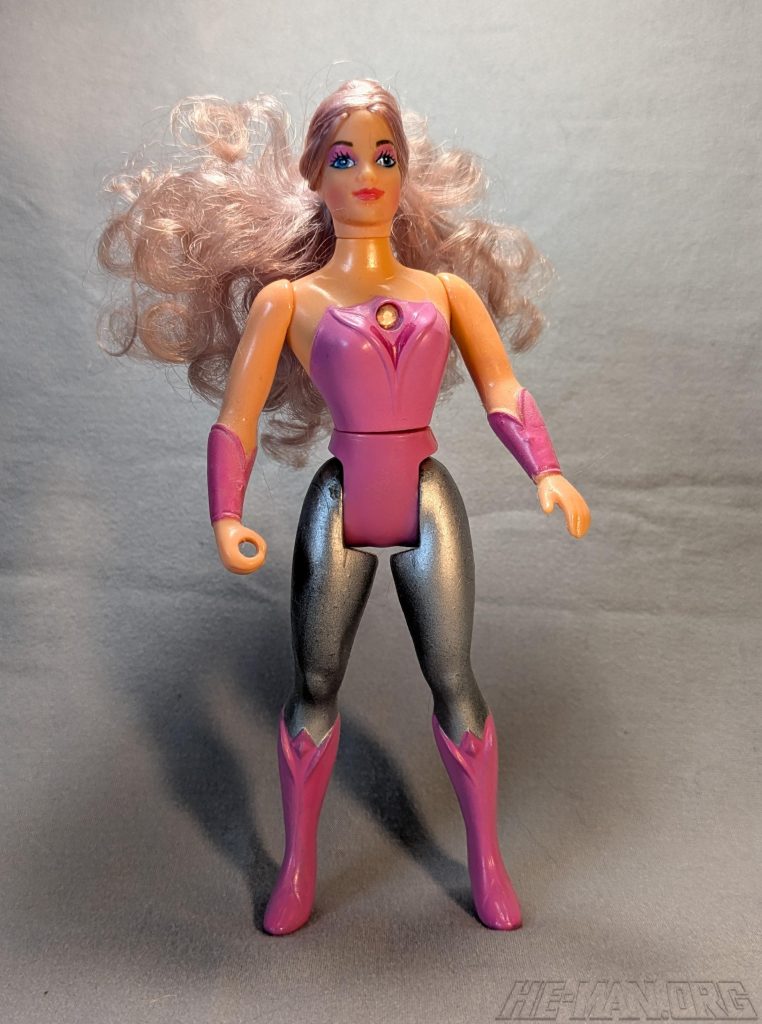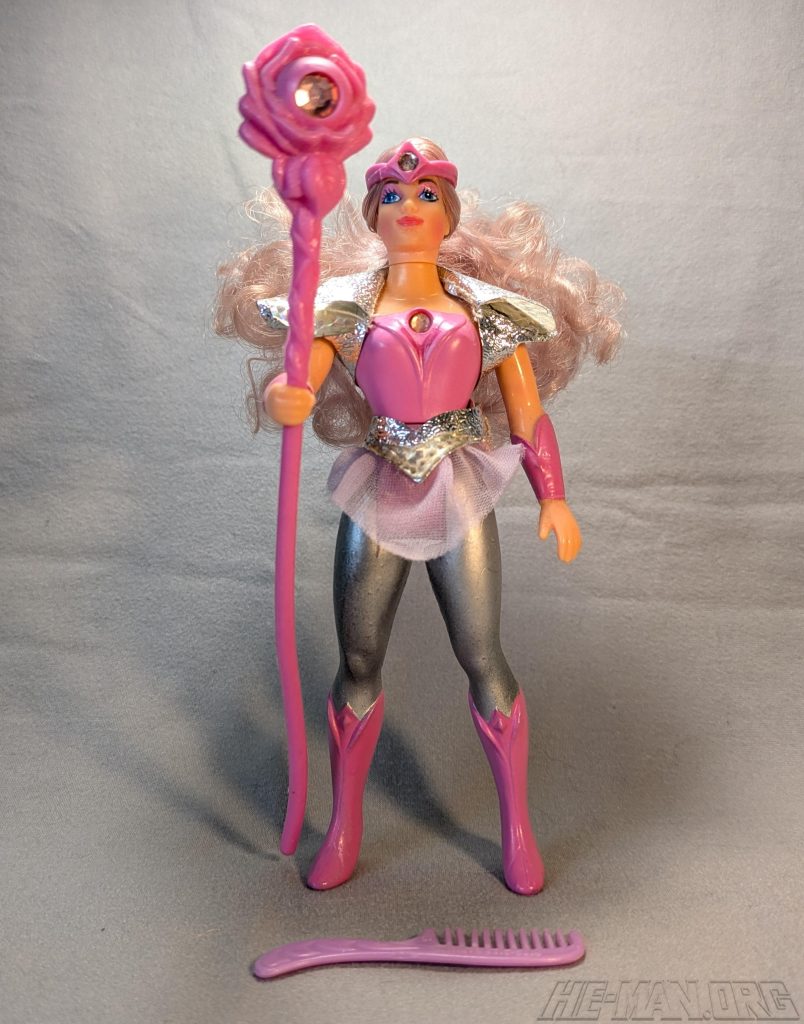 Glimmer, the guide who lights the way, was a light-themed figure with a glowing staff and headband. She featured a cloth goods costume, rooted hair, a staff, a removable headband, and a comb. She also had a spring-loaded waist twist feature.