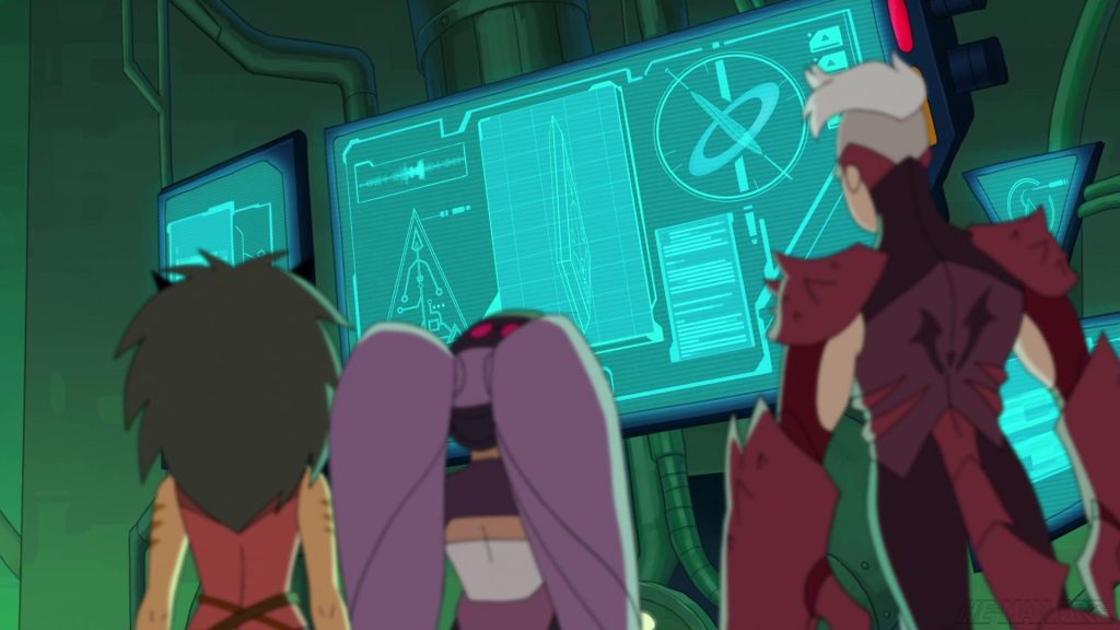 Meanwhile, in the Fright Zone, Entrapta’s experimentation with the First Ones tech is a breakthrough in her research, and validates a theory of hers. The data proves Etheria itself that was heavily altered deep from within by the First Ones. The planet is coursing with technology built by the civilization, leading to the conclusion that it can be hacked, but only if they can combine their inventions with a runestone. Scorpia then informs Entrapta the Horde has the Black Garnet.