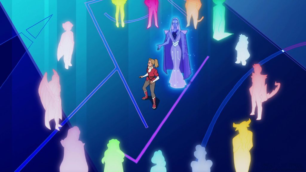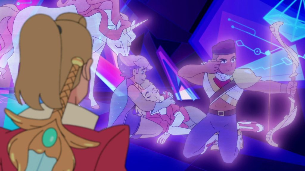 Glimmer, Bow, and Swiftwind enter the temple and begin looking for Adora. Swiftwind finds Adora in the Crystal Castle, and reminds Adora that she has been an immense help to countless people as both Adora and She-Ra. Realizing her friends truly care for her, and that she can’t fix anything by hiding, Adora returns to the battle. She saves Glimmer and Bow from more spider monsters, and they leave. As all four of them see the Horde’s hacking of the planet, they rush back to Brightmoon.
