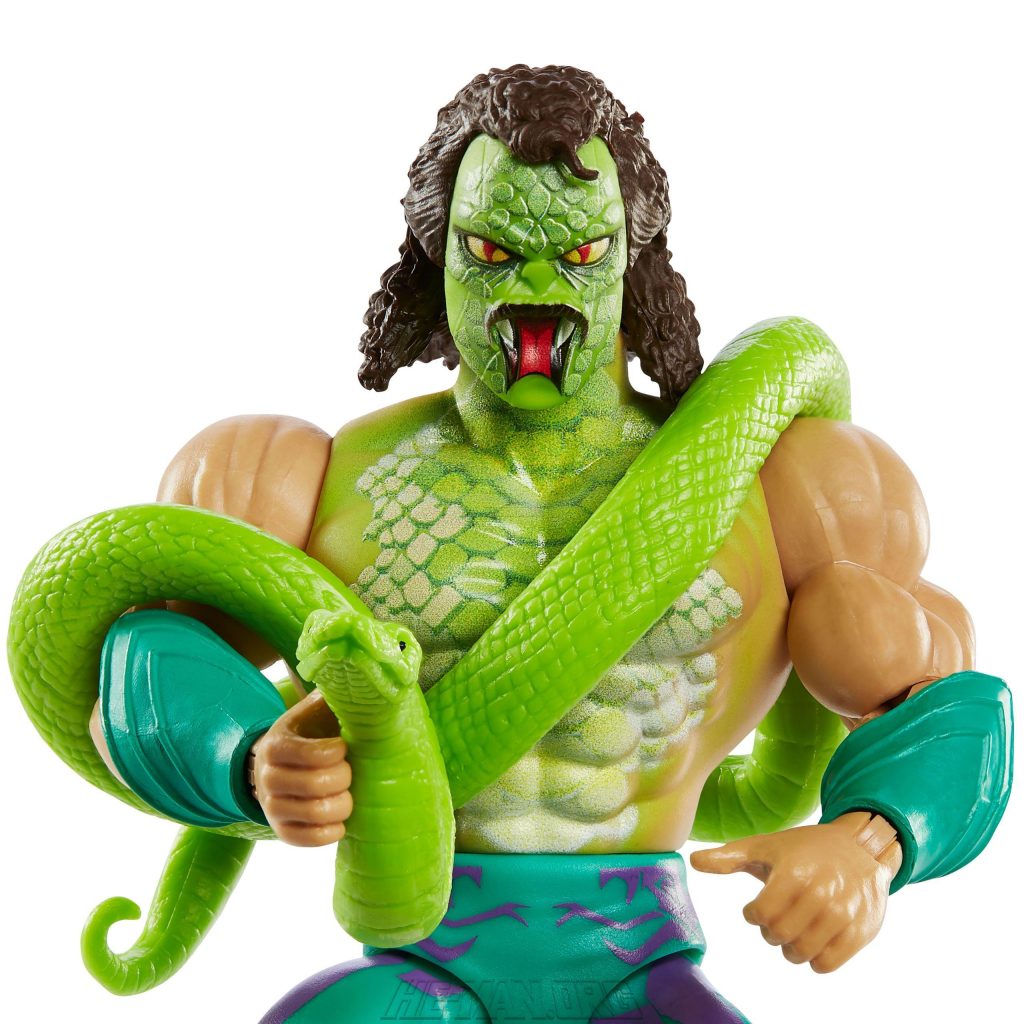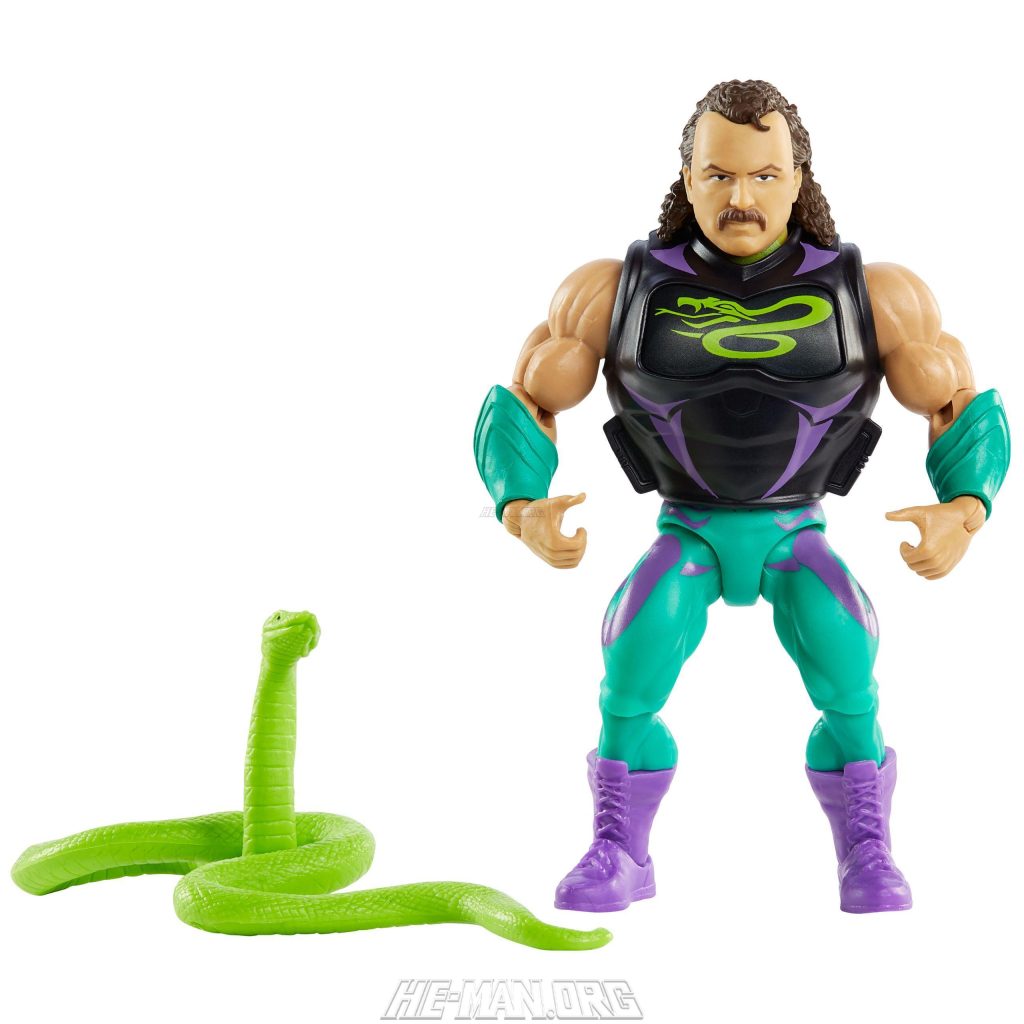 Masters of the WWE Universe Jake “The Snake” Roberts came with snake-themed battle armor, a pet snake, and a human mask that could be removed to reveal a snake face underneath.