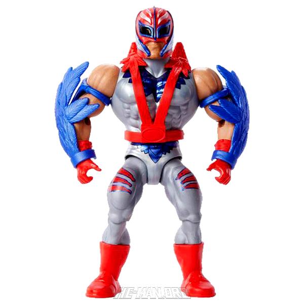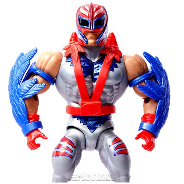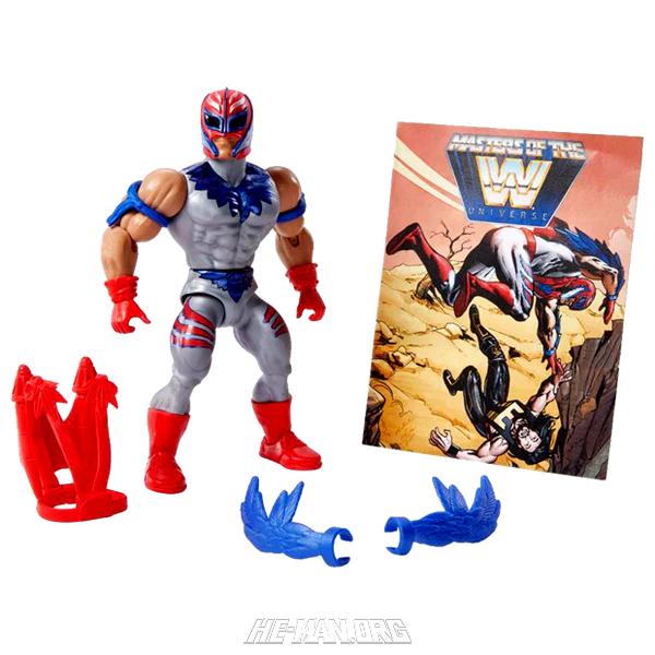 Masters of the WWE Universe Rey Mysterio came with a repainted version of the harness from MOTU Classics Stratos, and the wings from MOTU Origins Stratos. This second version of the character had a silver body suit.