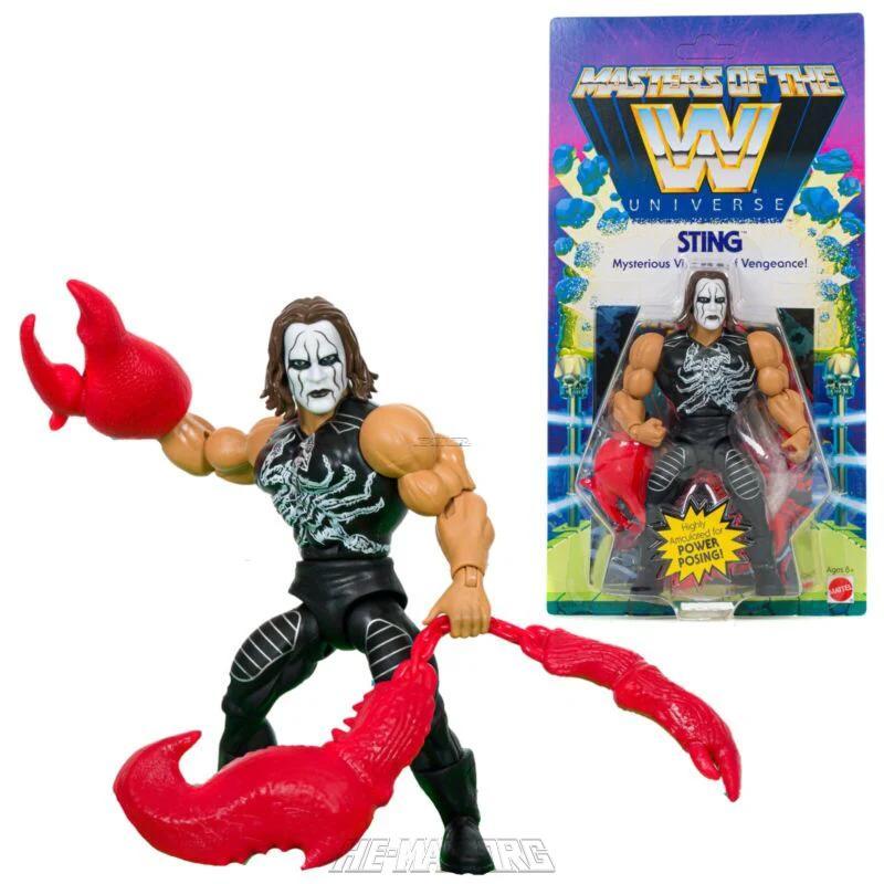 Masters of the WWE Universe Sting came with a scorpion claw hand attachment and a scorpion stinger weapon. The hand attachment would later be used for MOTU Origins Sting-Or, released in 2025.