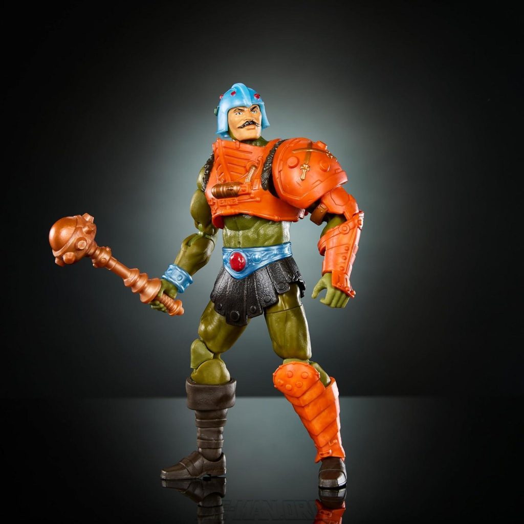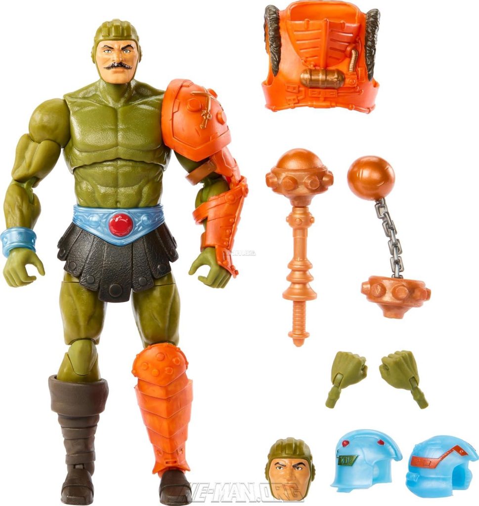 New Eternia Man-At-Arms was based on two different designs for the character from the early 1980s by Mark Taylor. He came with removable armor, a mace with a seperate ball and chain end attachment, two different heads, two different helmets, and an extra set of hands.