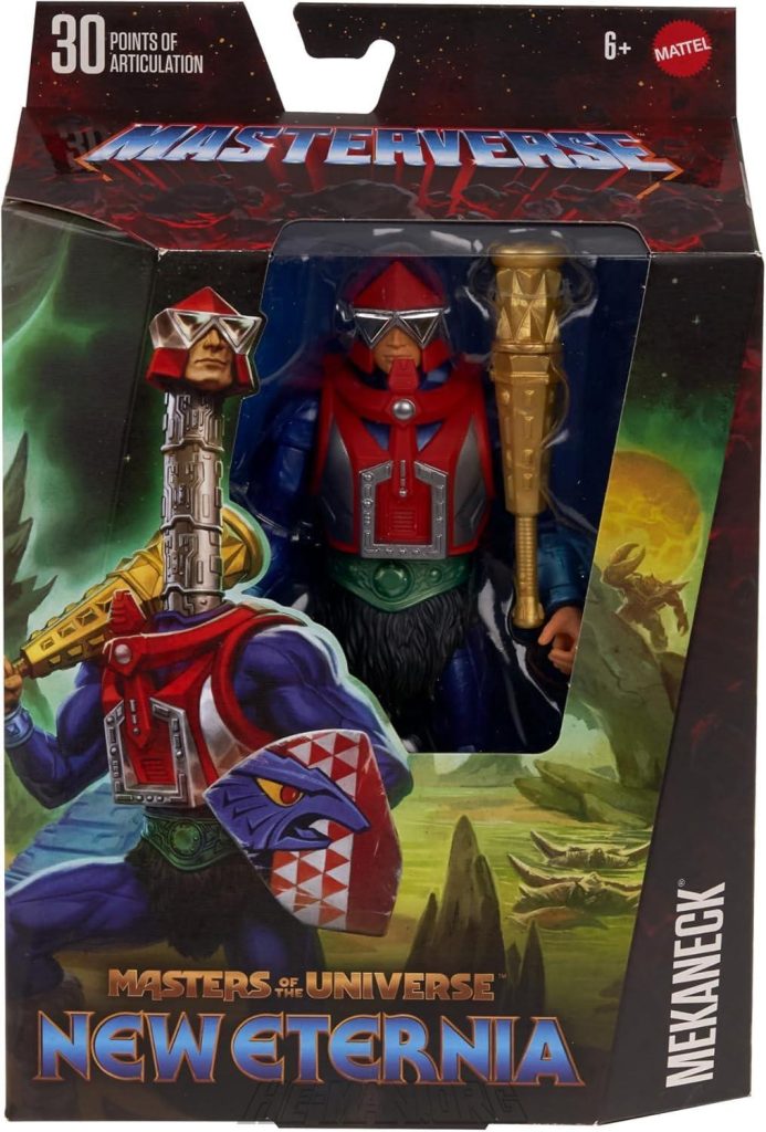 New Eternia Mekaneck came with several extras to add to his look. He came with five neck extension pieces, an extra set of hands, a club with a removable end, and two extra hands.He also had a shield showing the front of the Top Toys version of the Road Ripper, which was blue rather than the usual green.