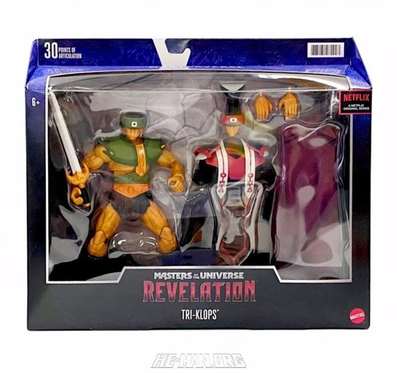 Revelation Tri-Klops was based on his appearance in the cartoon series. He came with two heads, two sets of chest armor, a sword, a cloak, removable bracers, and an extra set of hands. His accessories allowed him to change his costume and become an acolyte of Mother Board.