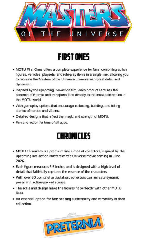 According to Preternia.com, Mattel is set to announce two new toylines in early 2026 in preparation for the upcoming Masters of the Universe Film (June 2026).