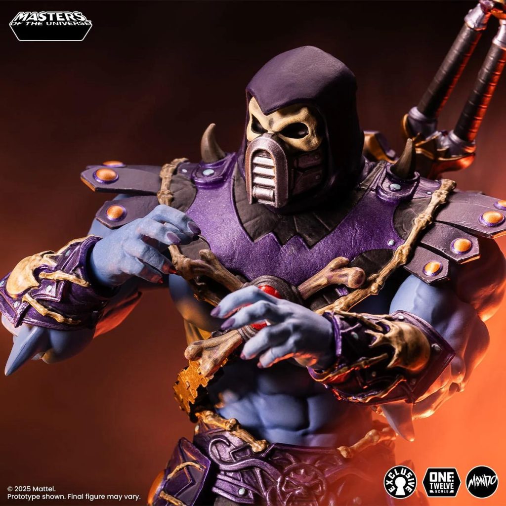 Mondo’s 1/12 scale Skeletor figure was based on the the character’s appearances in the 200x era. The regular release of the figure featured two halves of his sword, two heads, a cape, a Havoc Staff, and three sets of hands. The deluxe/timed edition came with a flaming Havoc Staff, a stand, two extra heads, and a gas mask.