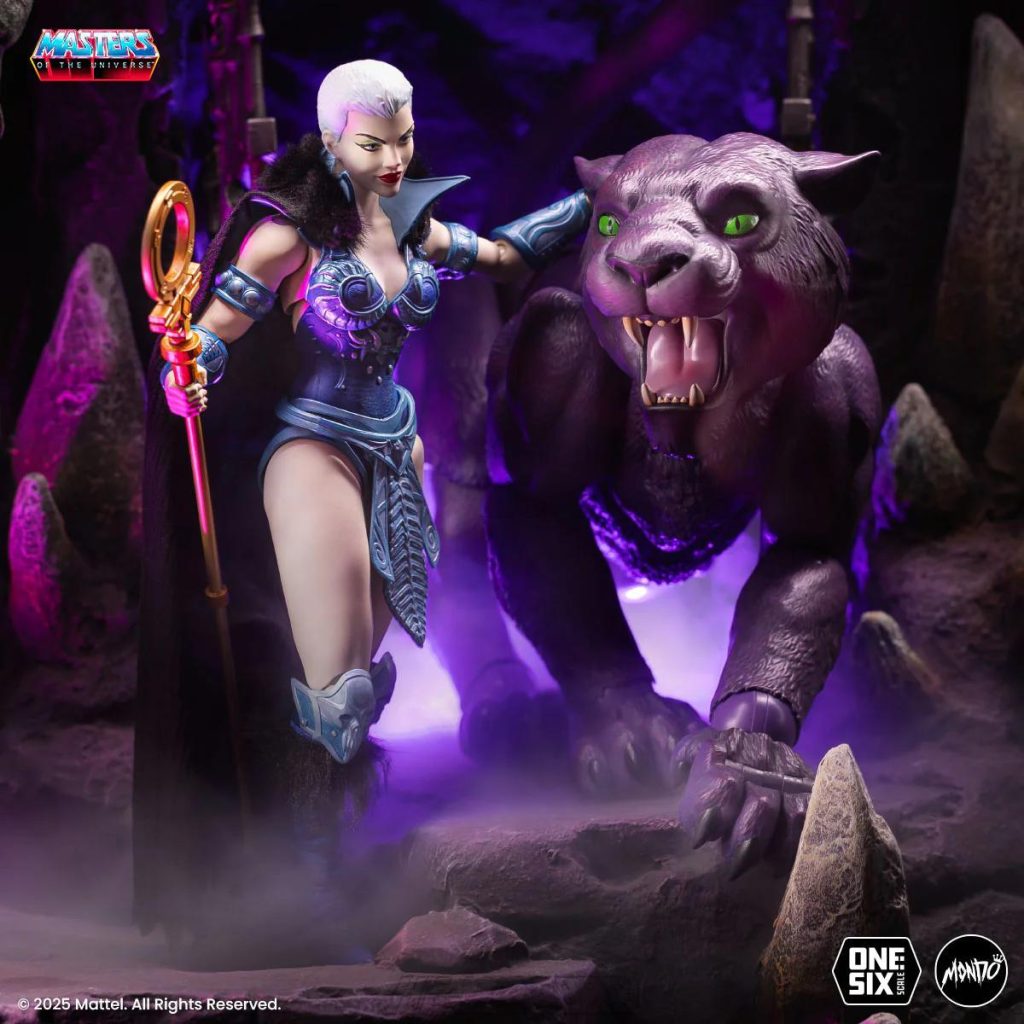 Mondo’s 1/6 scale Evil-Lyn came with four different heads, two staffs, a wand, a dagger, a removable cloth goods skirt and cape, a magic effect, removable waist decoration, four sets of hands, and Screeech with stand.