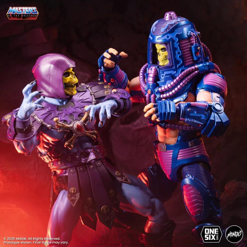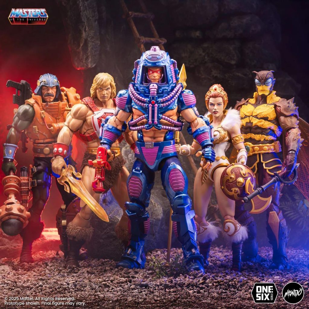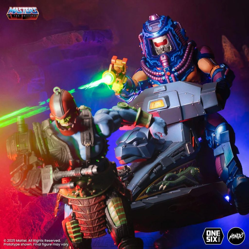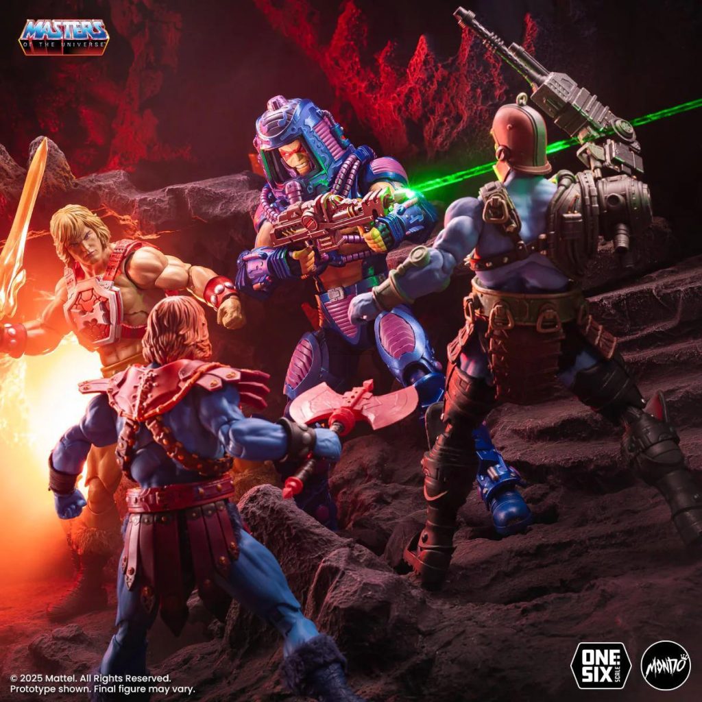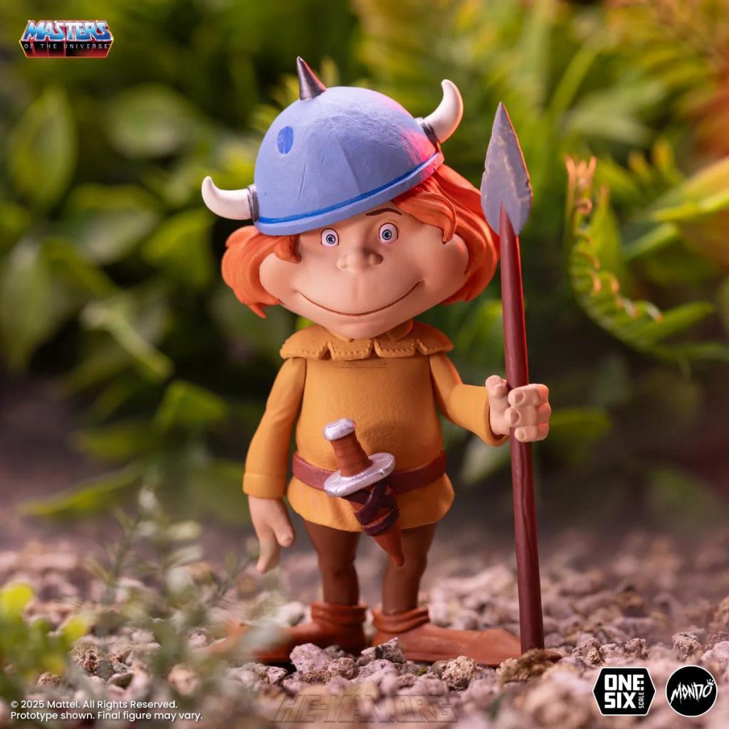 Mondo’s 1/6 scale Man-E-Faces figure was based on the the character’s various appearances in illustrations, comics, the vintage MOTU toyline, concept art and animation. He came with three removable, rotatable head drums and a separate full head. He had five pairs of hands, a blaster pistol, a rifle, a mace, and Squinch, a character from the Filmation He-Man series.