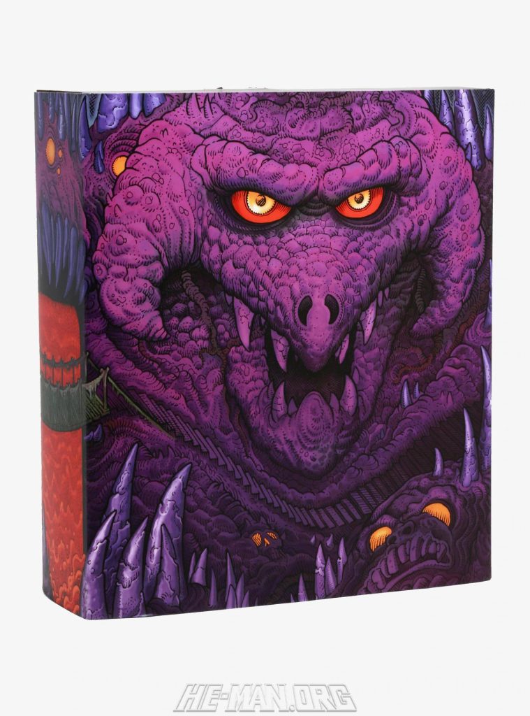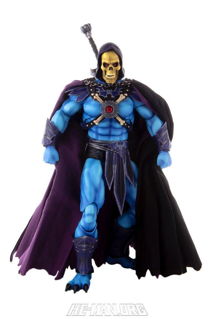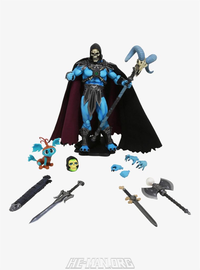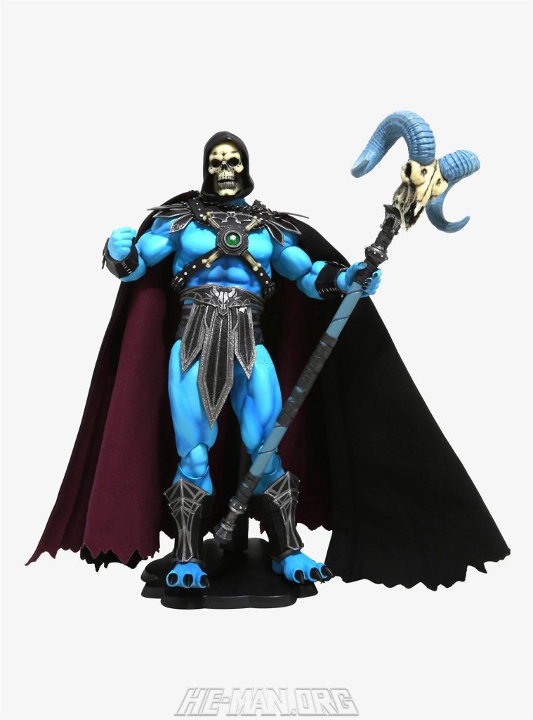The first 1/6 scale Skeletor from Mondo featured vintage and modern-style heads, a havoc staff, a Power Sword, a bone sword, scabbard, axe, four sets of hands, and Relay the Manchine puppy from the He-Man and She-Ra Christmas Special.