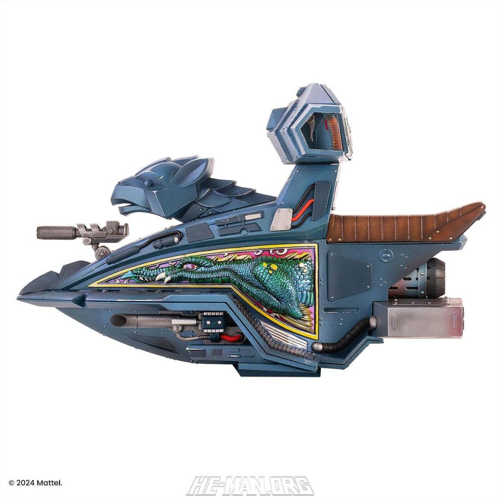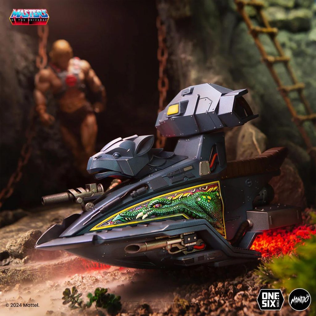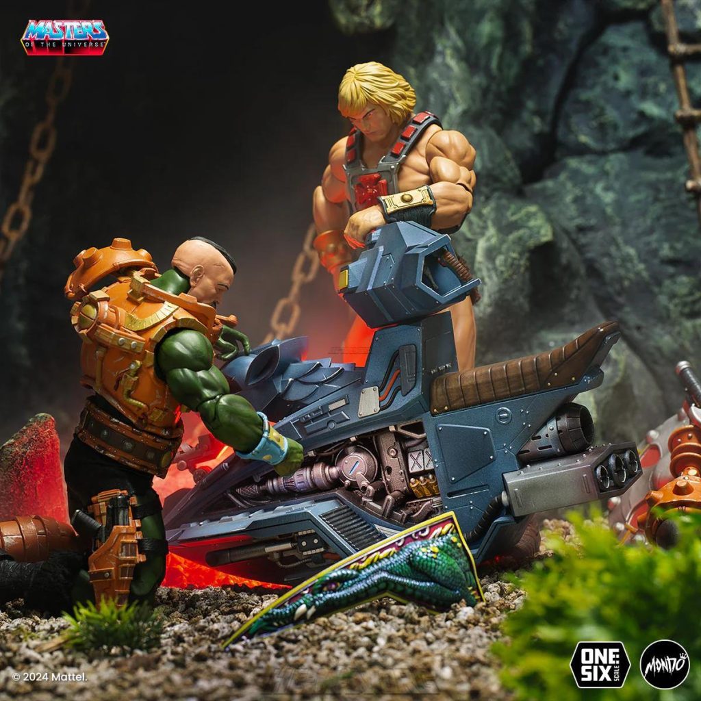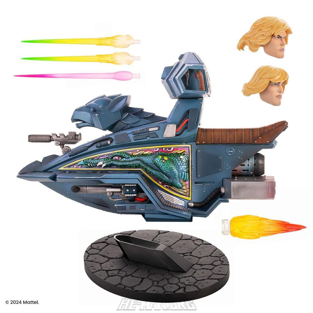 Mondo’s 1/6 scale Sky Sled was based on the front half of the vintage Battle Ram vehicle, with influences from the original concept art by Ted Mayer and the Filmation He-Man cartoon. It came with a stand, three blast effect, a jet engine fire effect, and two windblown hair heads for Prince Adam and He-Man.