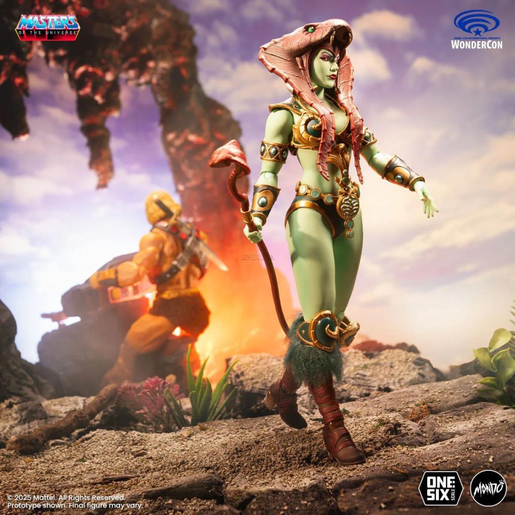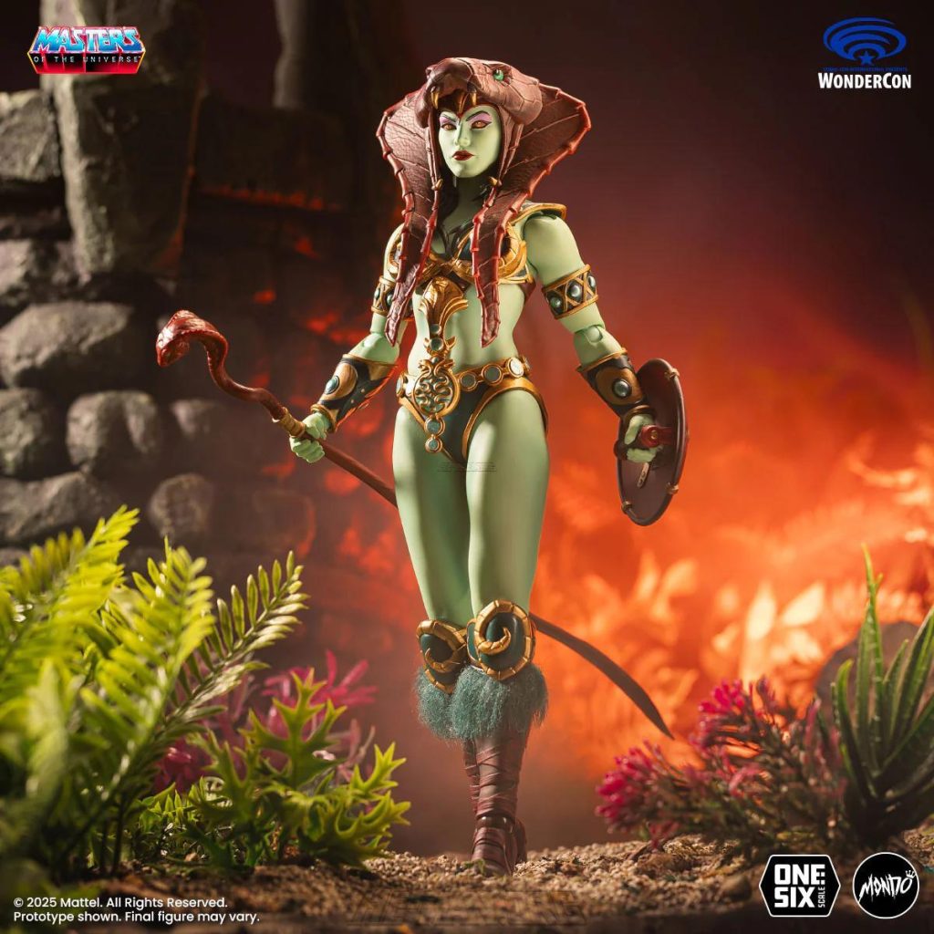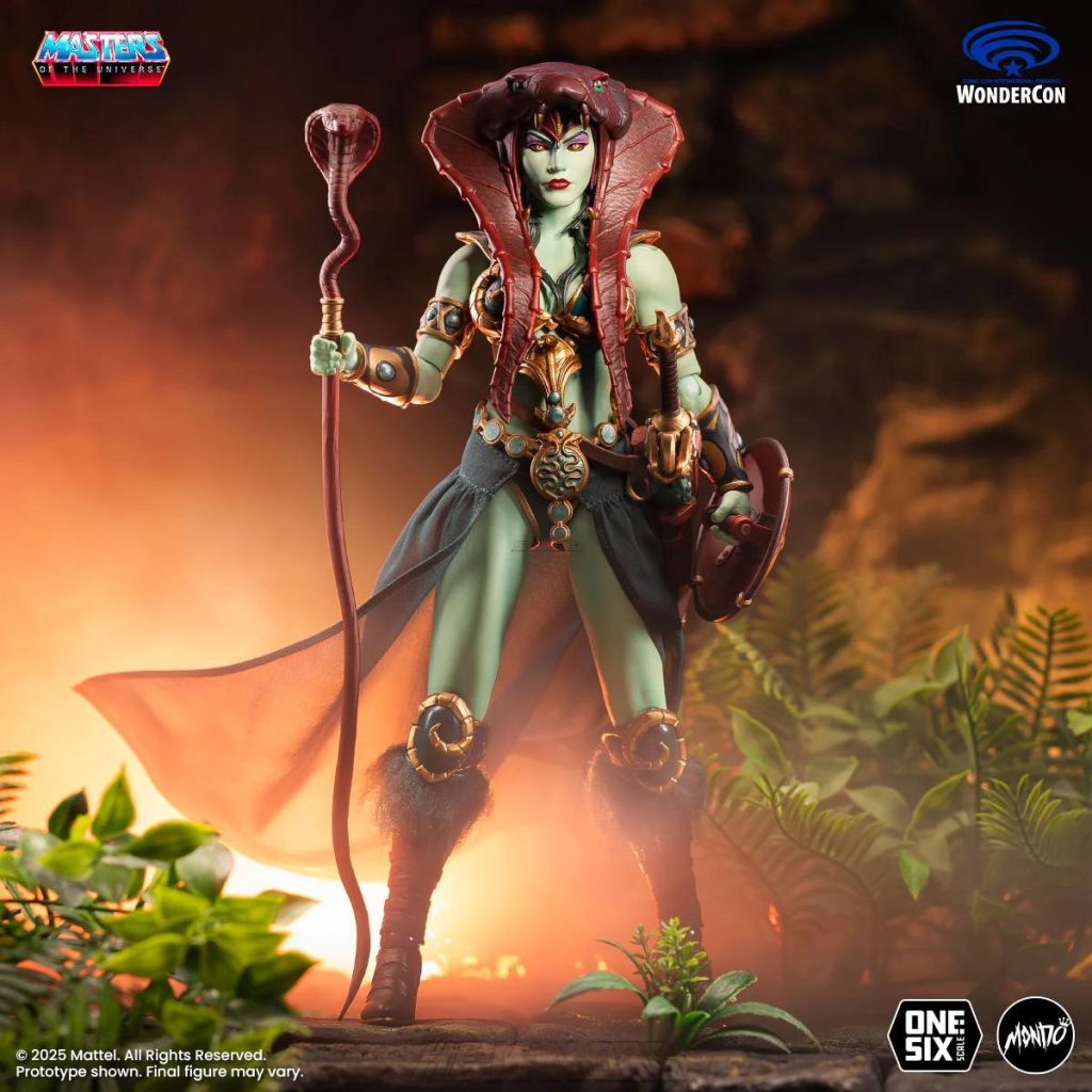Mondo’s version of the Goddess was based on her original appearance in the first Masters of the Universe mini comic, as well as appearances in modern MOTU stories by DC Comics. She came with three alternate heads, a staff, a spear, a sword with scabbard, a shield, a removable cloth skirt, and five pairs of hands.