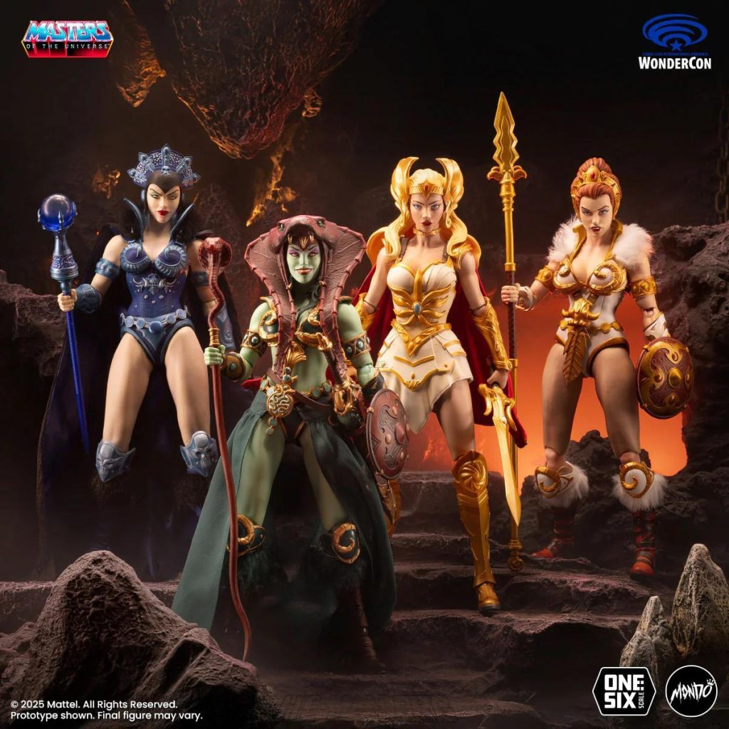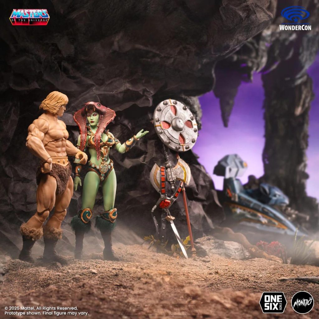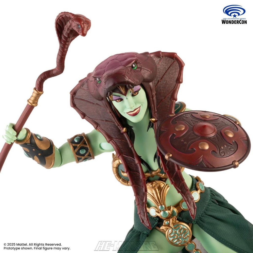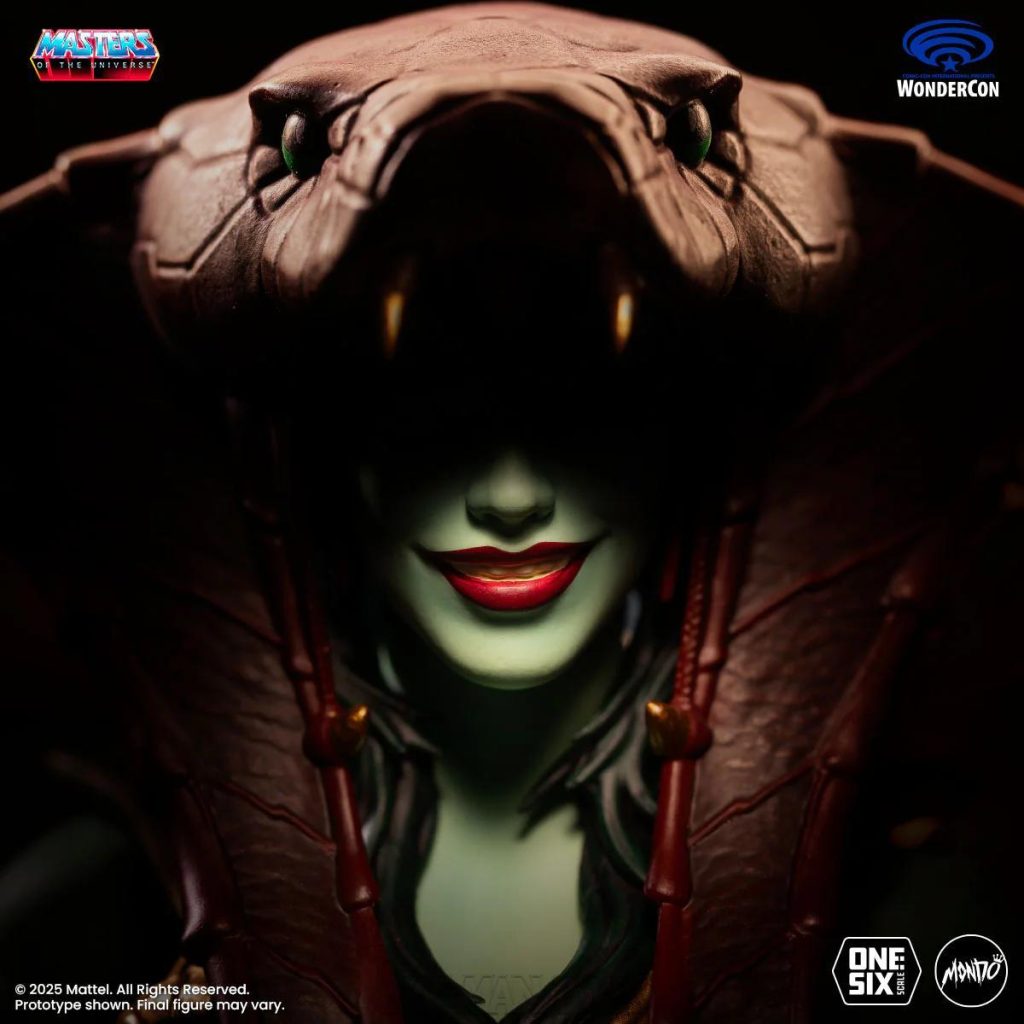 Mondo’s version of the Goddess was based on her original appearance in the first Masters of the Universe mini comic, as well as appearances in modern MOTU stories by DC Comics. She came with three alternate heads, a staff, a spear, a sword with scabbard, a shield, a removable cloth skirt, and five pairs of hands.