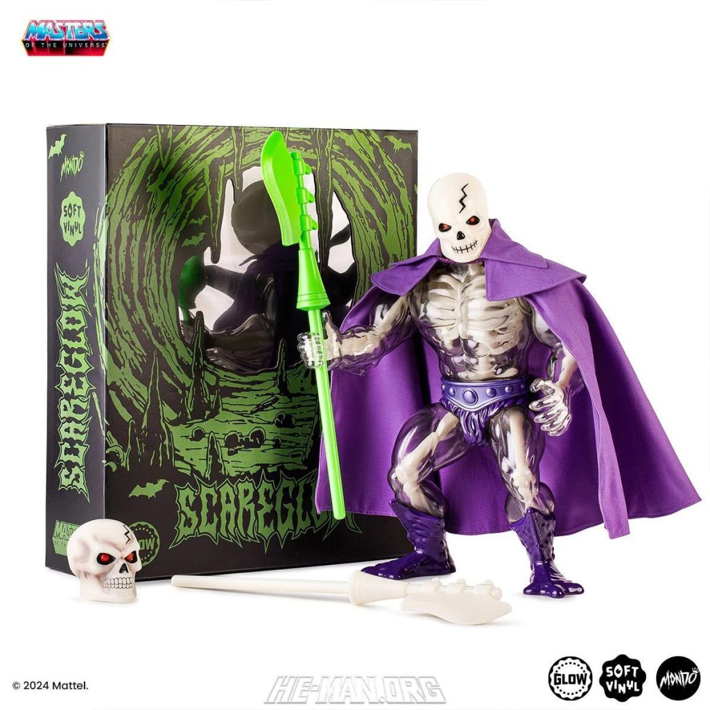 Mondo’s vintage style 16 inch Scareglow figure was based on the original figure from 1986. It came with two versions of the “Scythe of Doom” as well as an alternate head, and removable cloth cape. Unlike the vintage figure, its body was translucent and there was a full glow-in-the-dark skeleton visible underneath the outer shell.