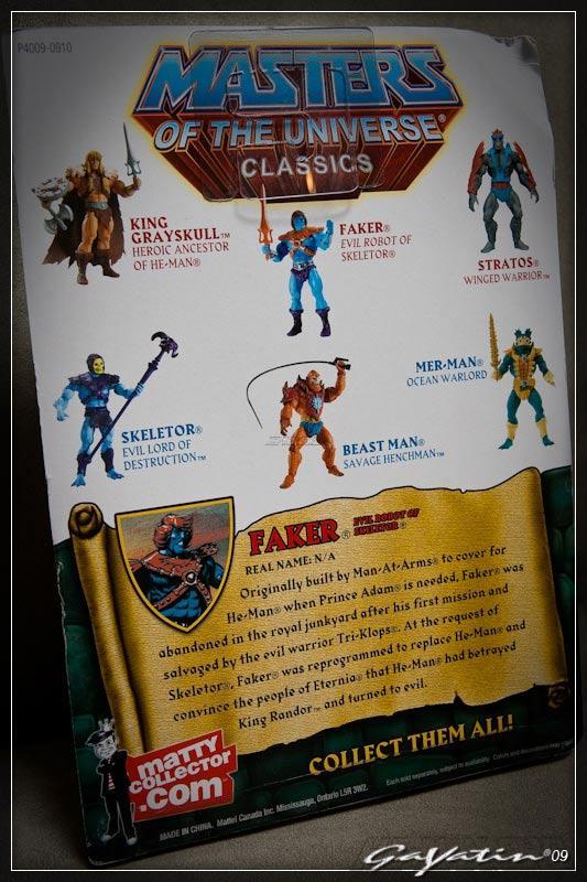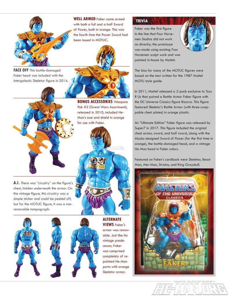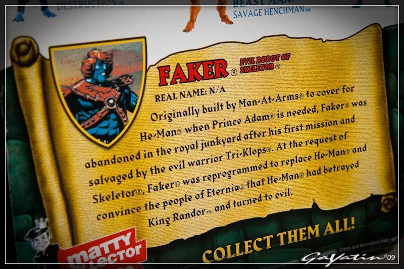 Unlike other figures in the MOTU Classics line, Mattel came up with the Faker prototype themselves rather than getting it from the Four Horsemen. Of course all of the parts used in the figure came from the Four Horsemen originally. The image below comes from OAFE, taken at C2E2 2011.
