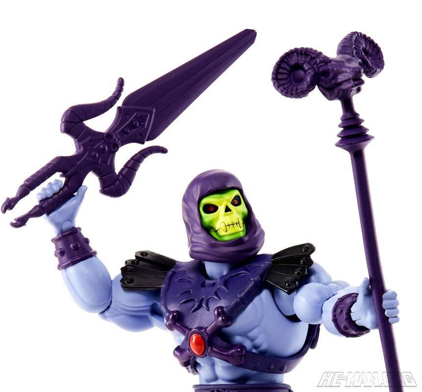 MOTU Origins 200x Skeletor was based on the character as he appeared in the 2002 Masters of the Universe reboot. He should not be confused with the 2026 MOTU Origins Cartoon Collection 200x style Skeletor figure, which featured a different sculpt and buck. He came with a sword, Havoc Staff, and removable armor.