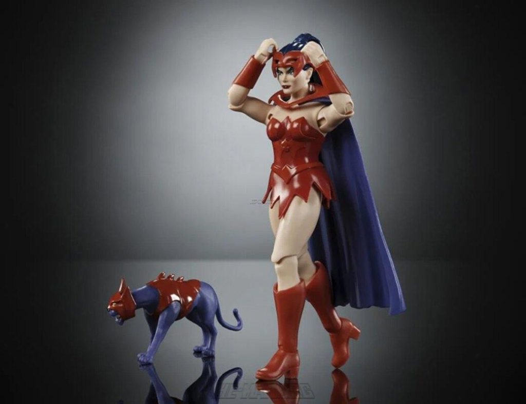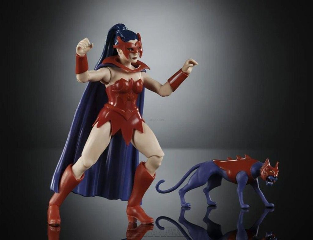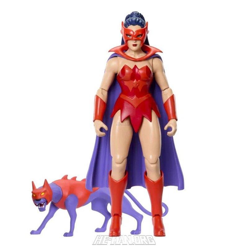 MOTU Origins Cartoon Collection Catra was based on the character as she appeared in 1985 She-Ra: Princess of Power series produced by Filmation. Catra came with a removable cape, a removable mask, and a miniaturized version of her cat form from the cartoon.