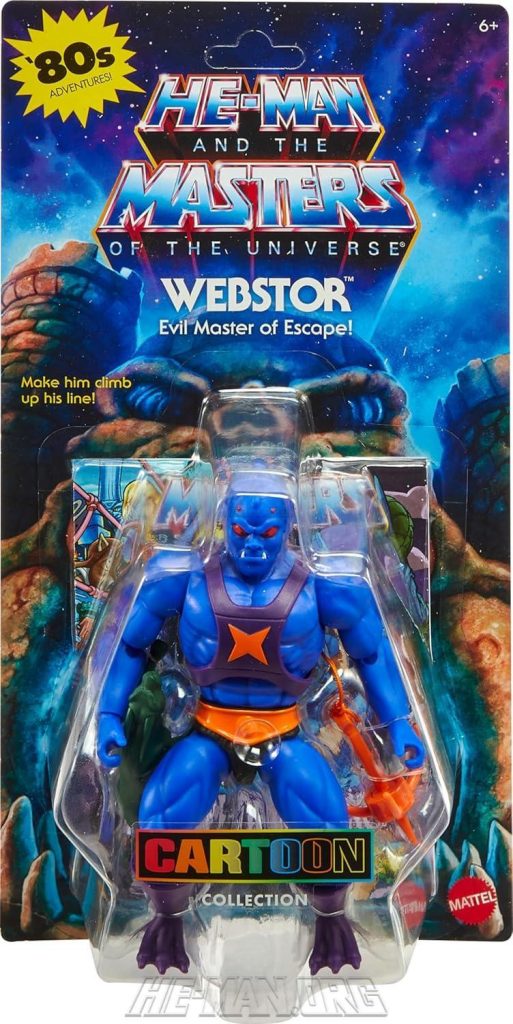 MOTU Origins Cartoon Collection Filmation Webstor was based on the character as he appeared in the 1983 He-Man and the Masters of the Universe series produced by Filmation. Webstor featured his climbing action feature, and came with the Grimalkin statue from the episode, “The Cat and the Spider.”