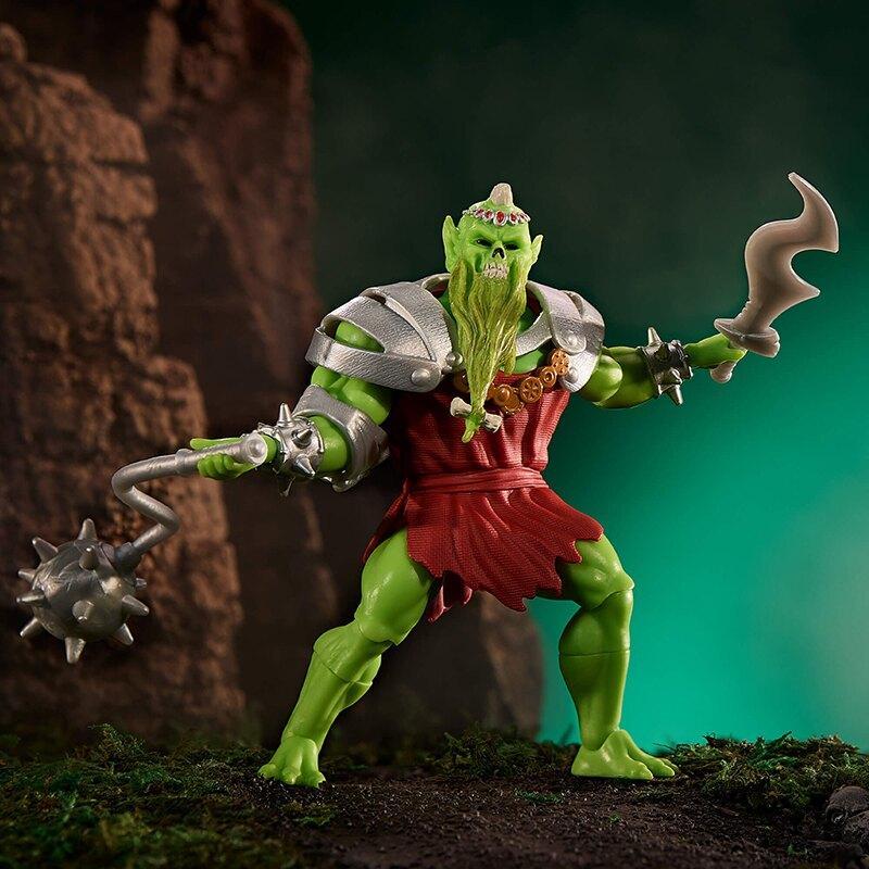 MOTU Origins Demo-Man was based on the concept character created by Mark Taylor. He came with two separate heads, two sets of hands, a club, a laser gun, and a venom spray effect.