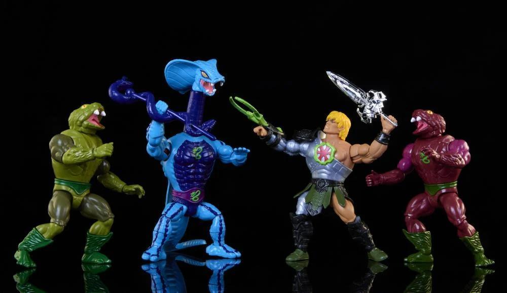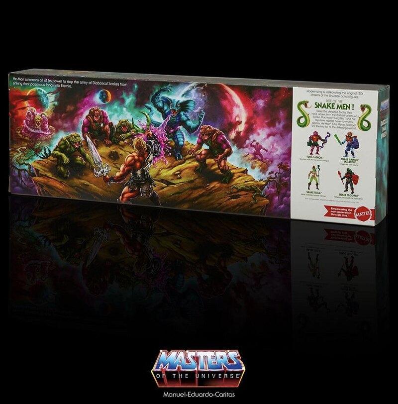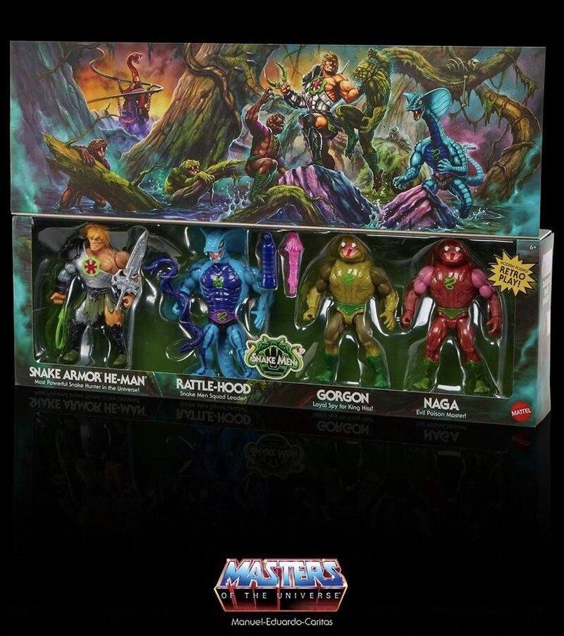 The MOTU Origins Diabolical Snake Invasion four pack included three brand new Snake Men warriors (Battle-Hood, Gorgon, Naga), and a repaint of Snake Armor He-Man. Packaging images via Roy Juarez.