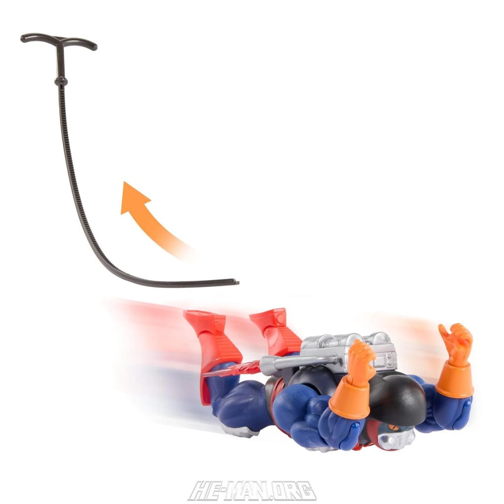 MOTU Origins Dragstor was based on the original 1986 figure. Like the vintage figure, he had a ripcord-activated drag race action feature. He also came with a gray Horde crossbow and two fire effects that could plug into the exhaust nozzles on his backpack.