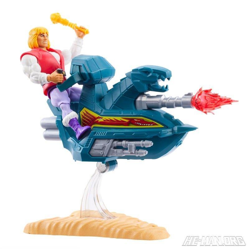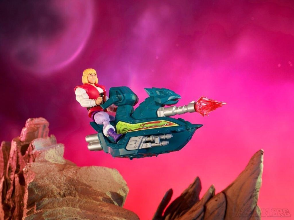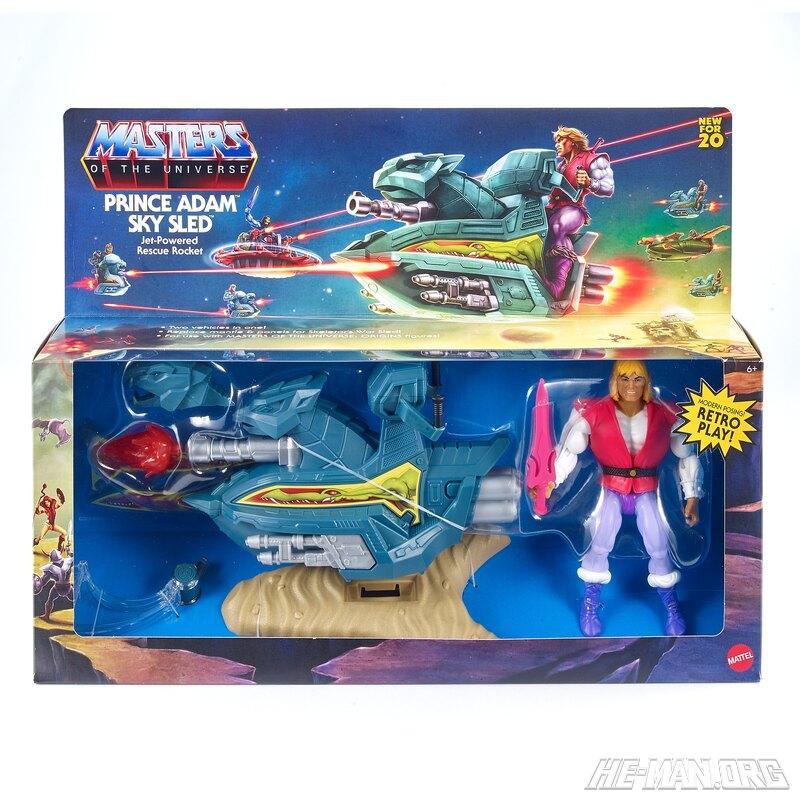 MOTU Origins Prince Adam and Sky Sled were loosely based on the original 1984 Prince Adam action figure and the 1982 Battle Ram vehicle (the front half, anyway). Prince Adam was produced in Filmation-style colors and came with a Power Sword in pink. The Sky Sled came with a blast effect and a stand. It also included an extra figurehead and side panels so that it could be transformed into the evil War Sled or Doom Buggy.