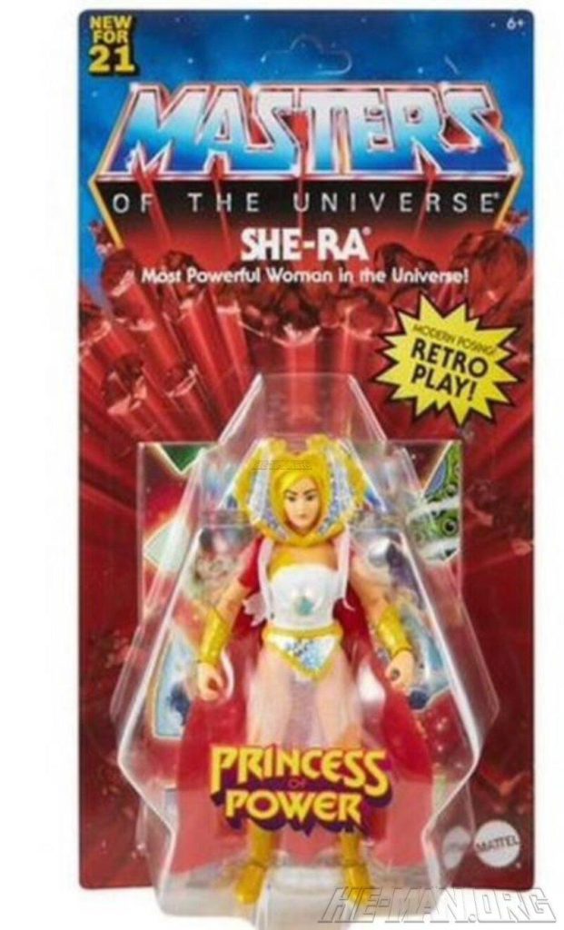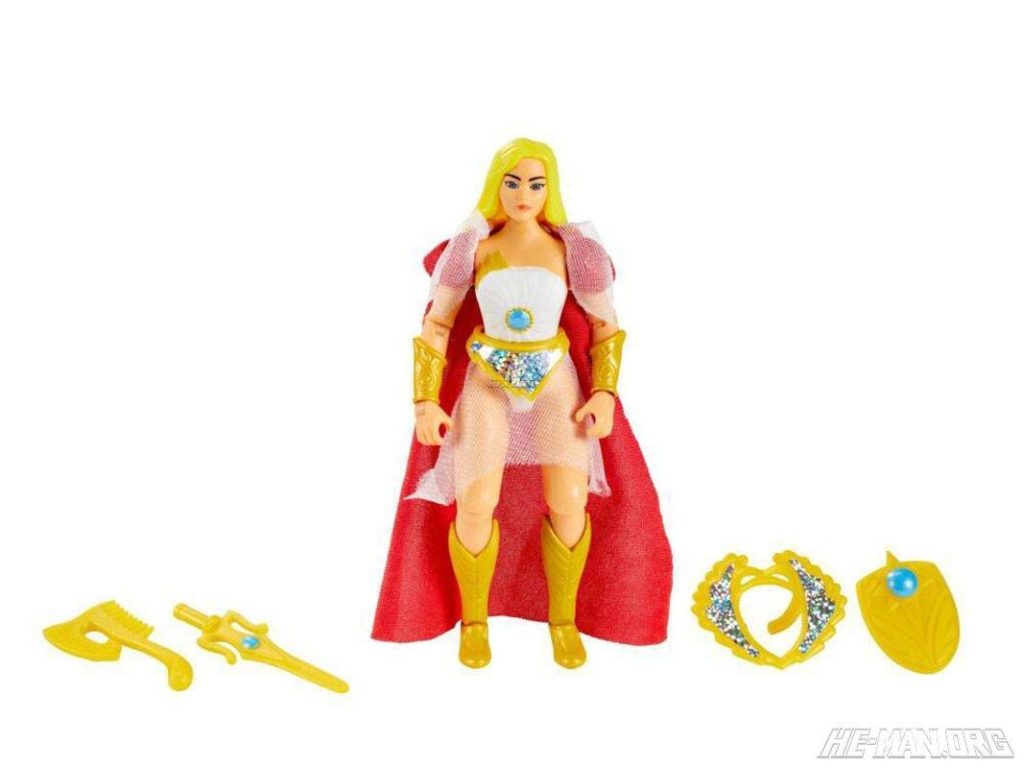 MOTU Origins She-Ra was based on the original 1985 Masters of the Universe figure. She came with the Sword of Protection, an axe-comb (inspired by the MOTU Classics figure), a removable mask/tiara, and a shield. She also had a cloth cape and skirt.