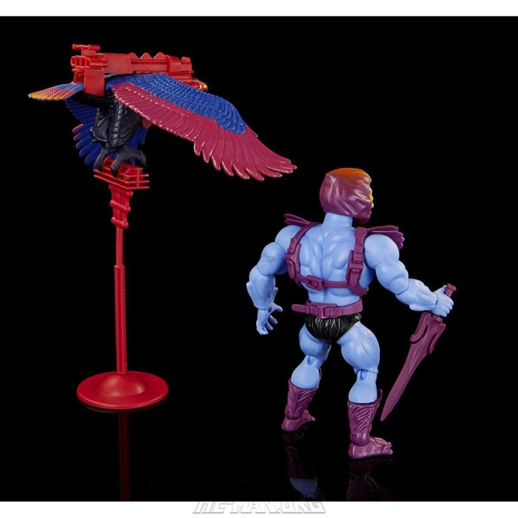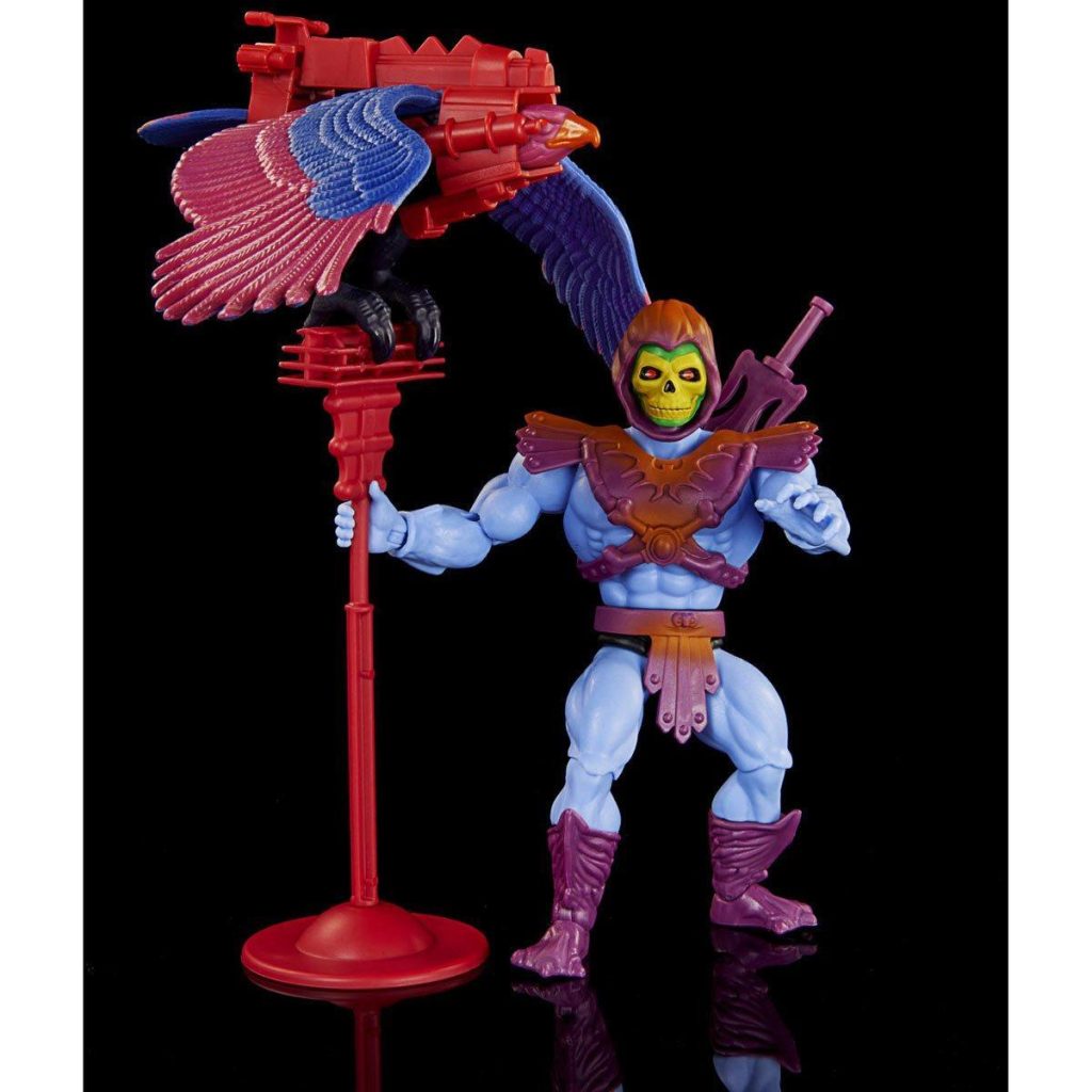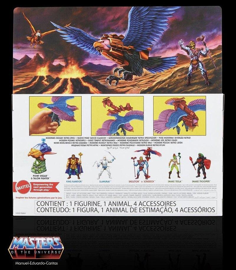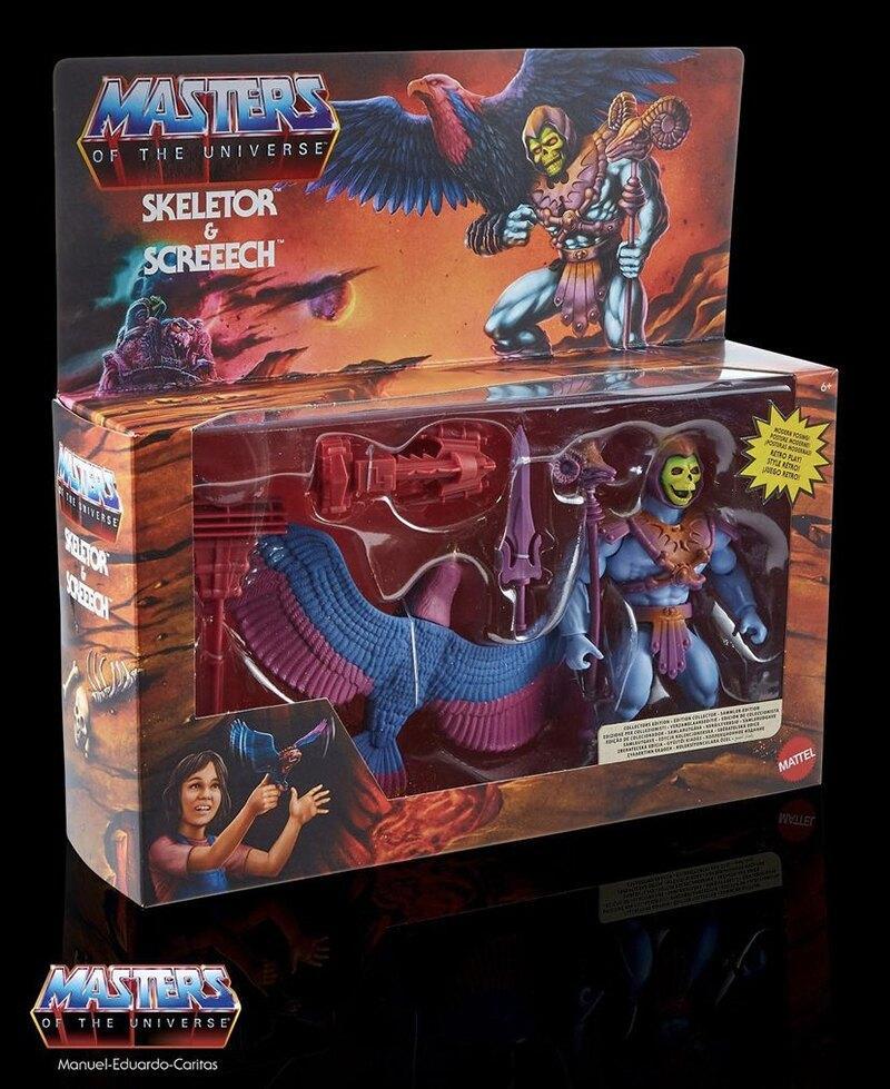 MOTU Origins Skeletor & Screech was based on the original 1983 Masters of the Universe gift set. Skeletor was painted in colors to match the original 1980s artwork by Rudy Obrero, and he came with a new head with an articulated jaw. Screech came with a perch and armor and retained the wing-flapping feature of the original toy. Packaging images via Roy Juarez.