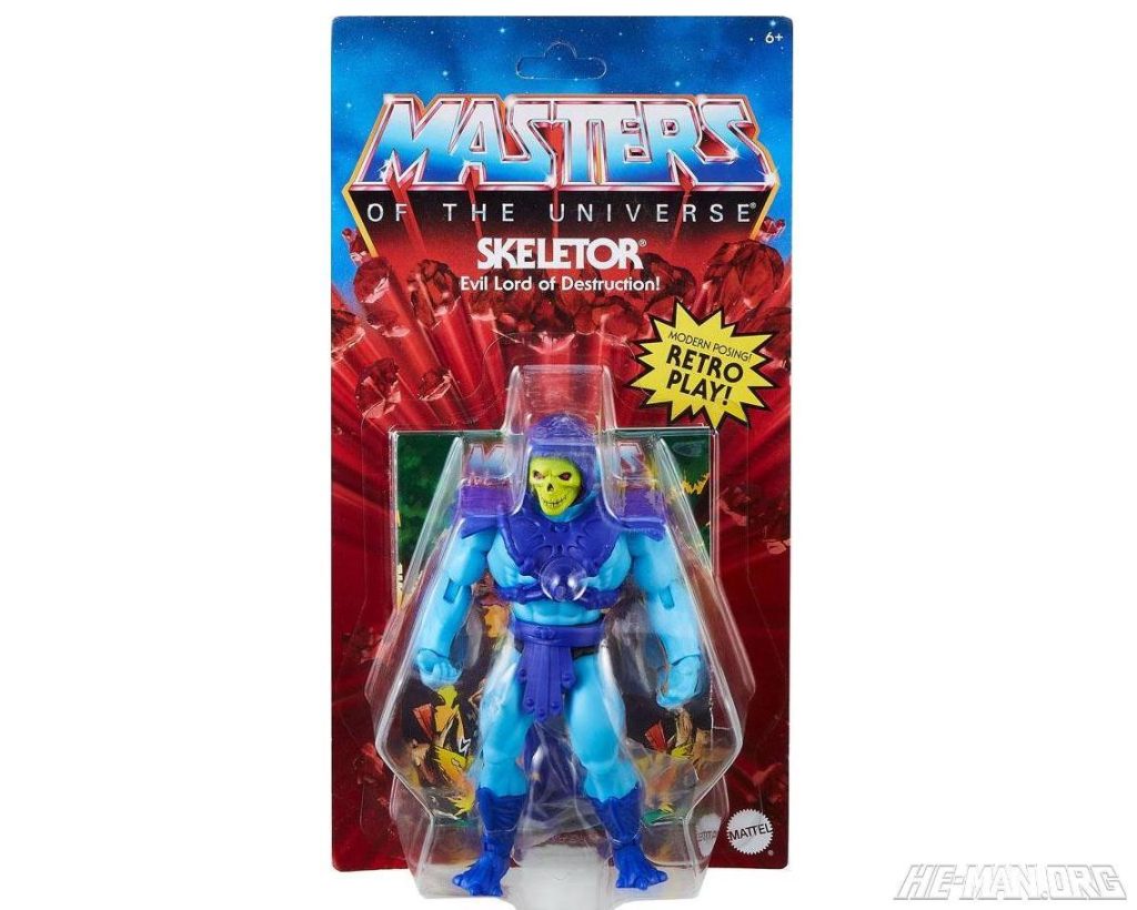 MOTU Origins Skeletor was re-released in 2021 with an updated head with a closed mouth. The figure was based on the 1982 Masters of the Universe Skeletor toy. He came with removable armor, a Havoc Staff, and a full Power Sword.