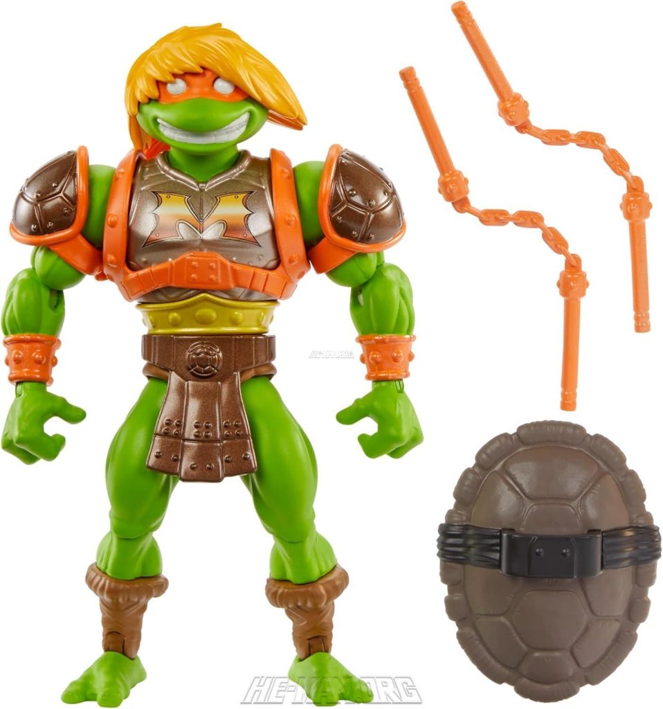 MOTU Origins Turtles of Grayskull Michelangelo came with two nunchucks and a shell that could double as a shield. His armor was based on Flying Fists He-Man, and he had comical He-Man-like blonde hair.