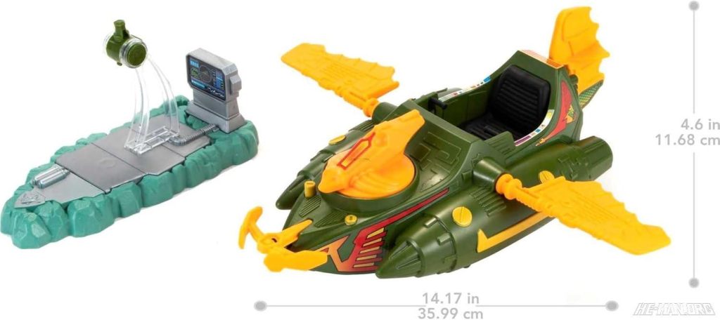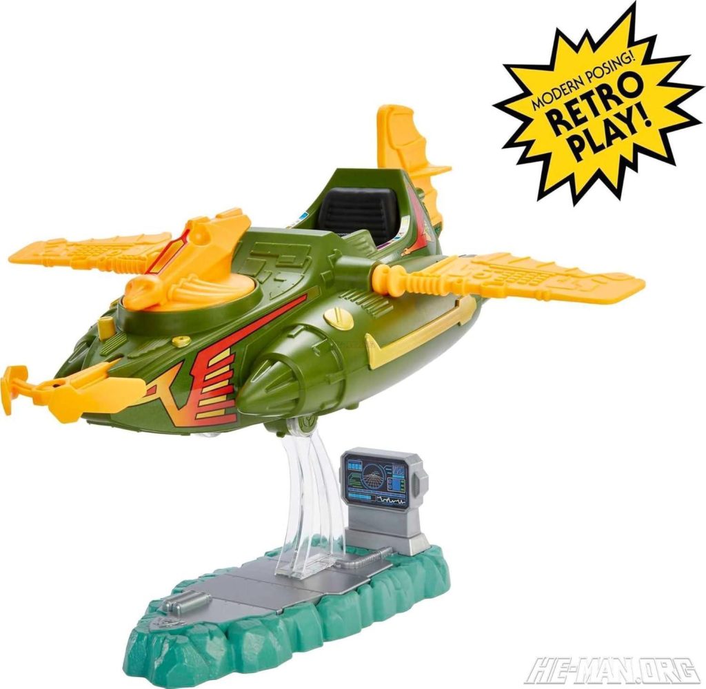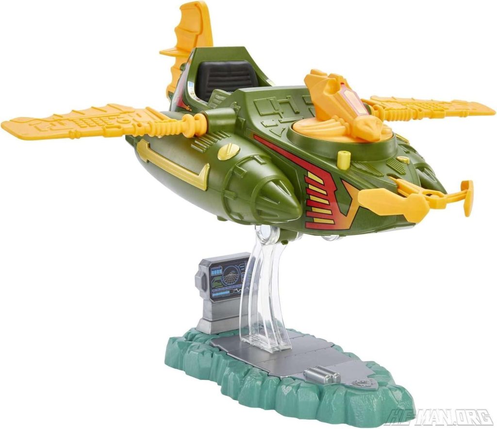 MOTU Origins Wind Raider was based on the original 1982 Masters of the Universe vehicle. It came with a flight stand on a Grayskull green base with a computer monitor.