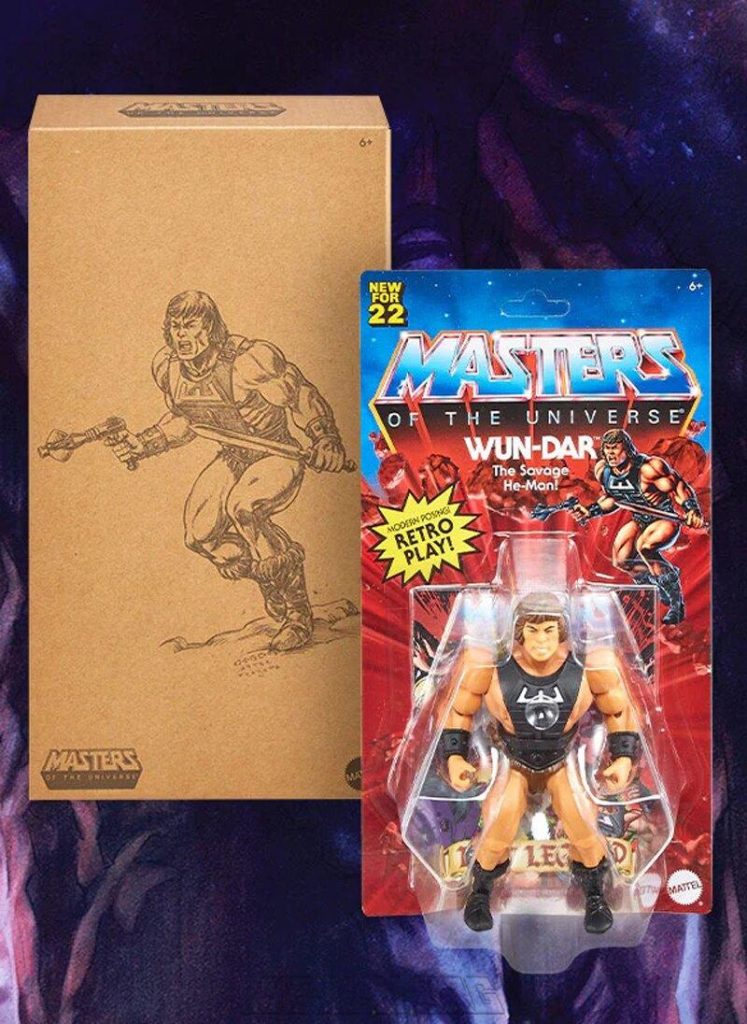 MOTU Origins Wun-Dar was based on the original 1983 Masters of the Universe figure, who was actually known as “Special Edition He-Man” internally at Mattel. He came with black Zodac armor, originally released in the 1984 Weapons Pak. He also came with a brown Zodac gun, a brown short sword, and a brown short axe.