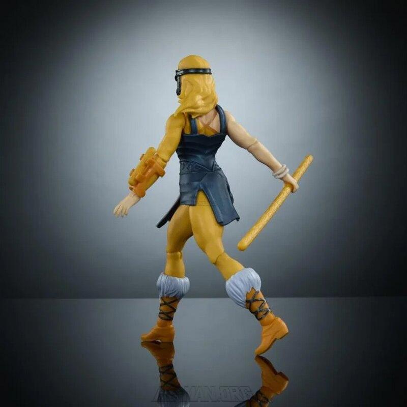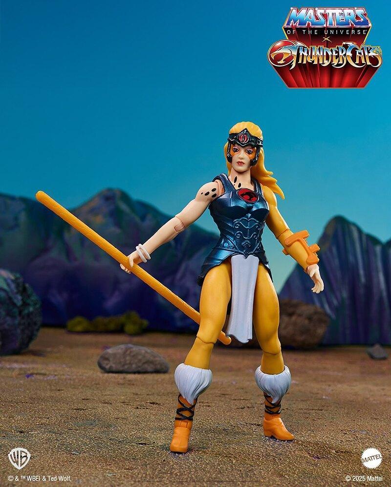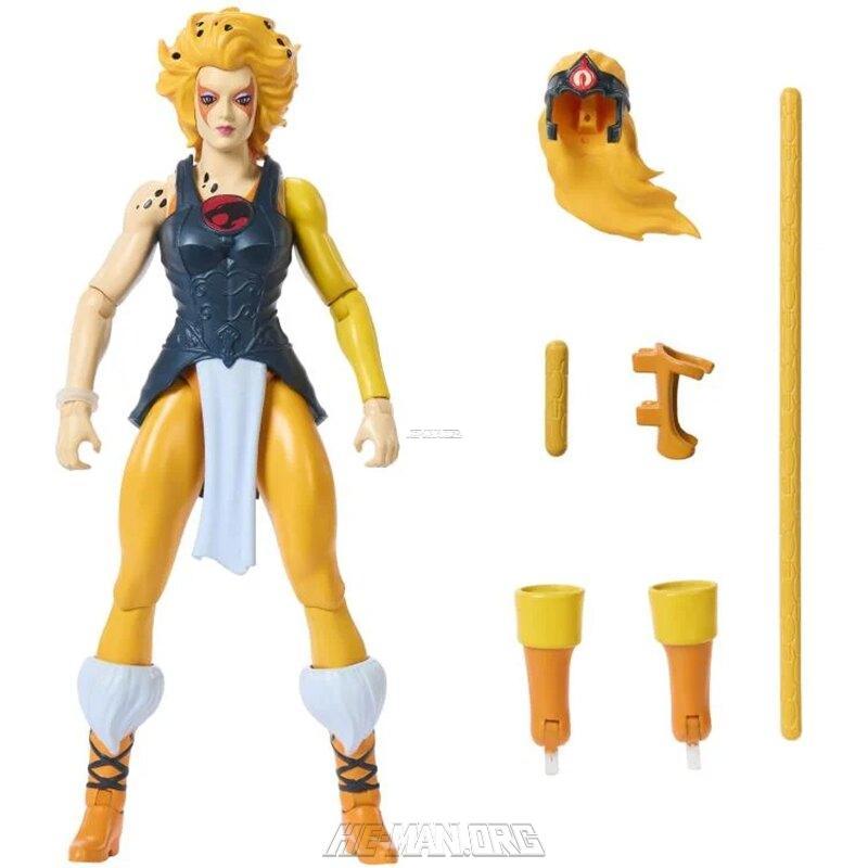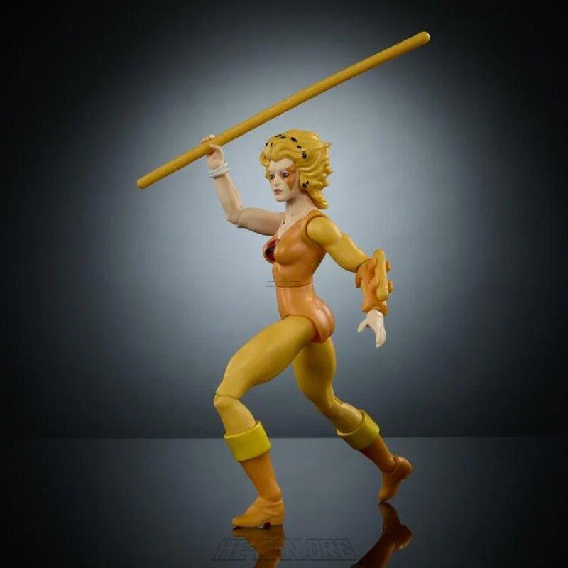 Masters of the Universe x Thundercats Cheetara featured a removable costume and removable hair and boots to allow the figure to look like the classic Thundercats character or a MOTU-ized version of the character. Aside from the removable costume parts, she also came with her signature bow staff.
