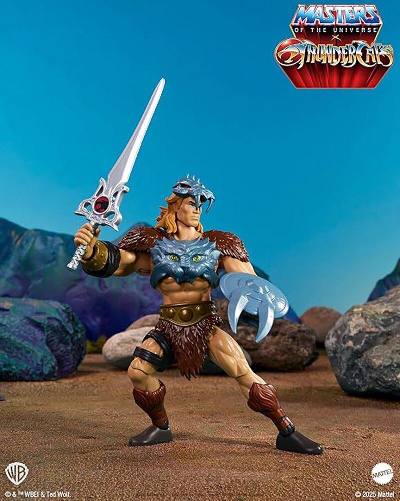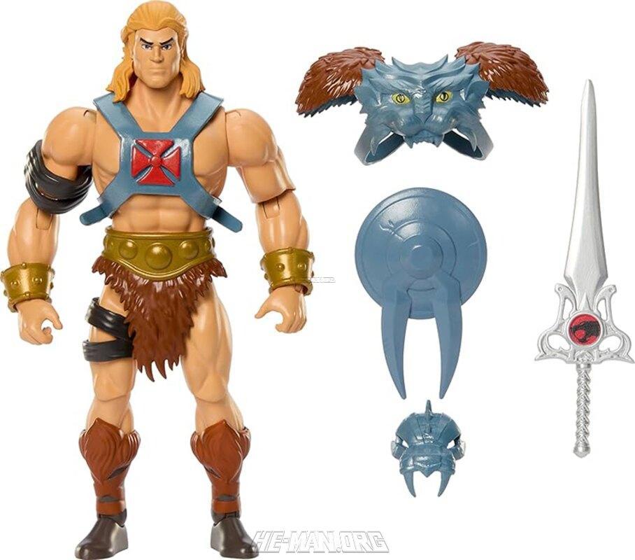 Masters of the Universe x Thundercats He-Man featured removable cat-themed costume elements to allow him to have his classic look or a new Thundercats-style look. He came with a sword that was a mashup of the Power Sword and the Sword of Omens.
