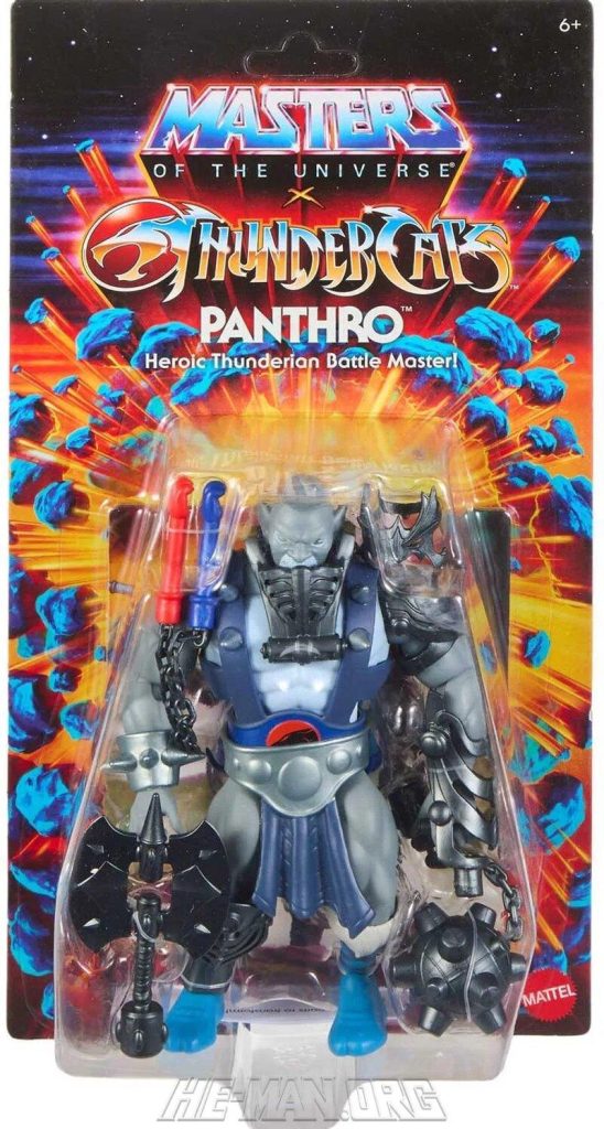 Masters of the Universe x Thundercats Panthro featured removable costume and removable hair and boots to allow the figure to look like the classic Thundercats character or a MOTU-ized version of the character. Aside from the removable costume parts, He also came with his signature nunchucks that could be enhanced with axe and a flail attachments.